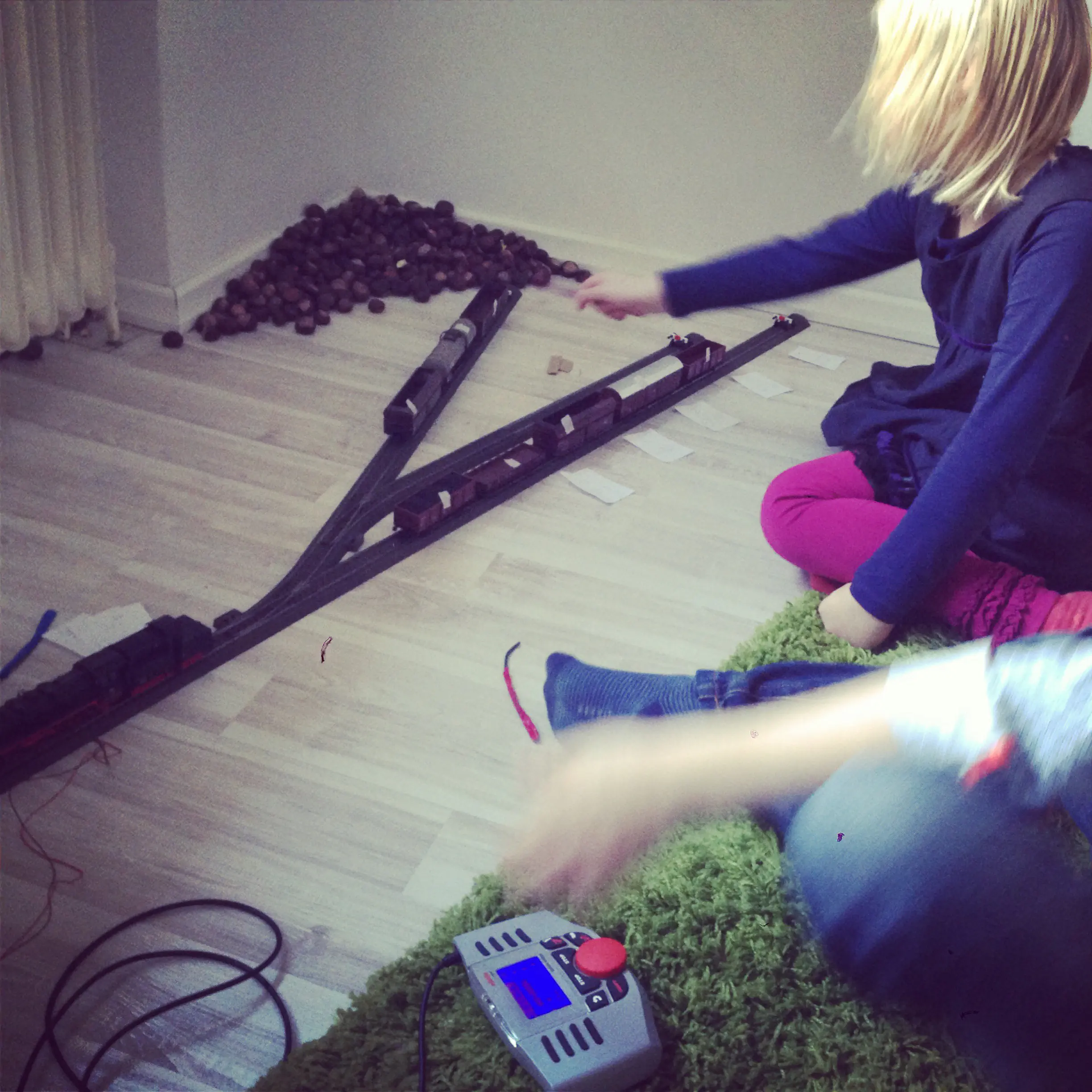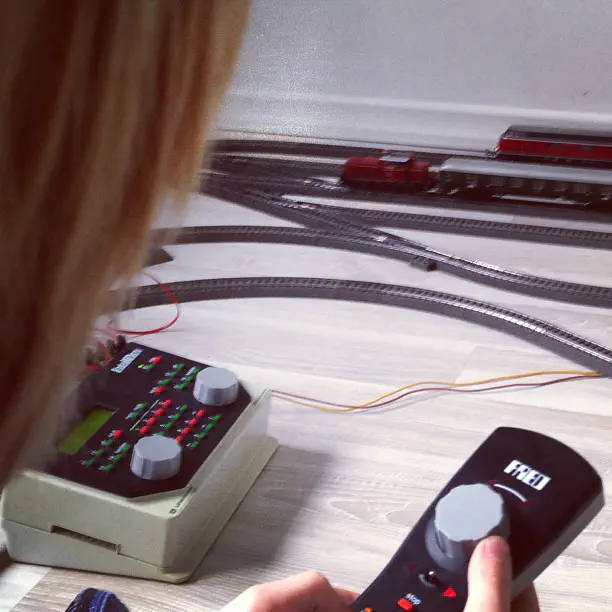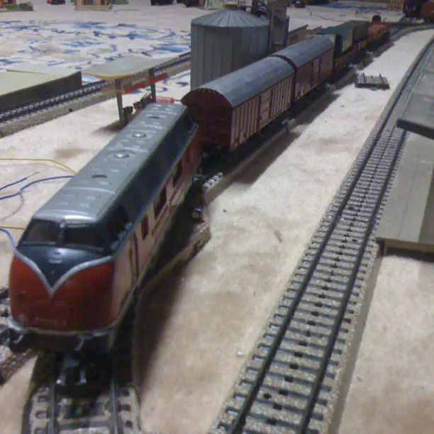 My model railroad inventory had a very long sleep on the attic of our house. Years later my railroad boxes made another move. Into my own house. In 2012 i stumbled about an archive of many issues of the magazine MIBA. I have spent a lot of time reading through many issues and this gave my interest a new life. In October I decided to look through my railroad stuff and unpacked the boxes, together with my to my son. He was six years old at that time. At first I decided to convert my locomotives to a digital system. I bought some inexpensive decoders and got an used Intellibox on eBay. Me and my kids set up a some track on the floor in the attic. The attic is not insulated, that was a climate challenge with low temperatures during this time of the year. I bought some of the new C-Track, so we could set up a really large layout. On Christmas a new locomotive (V60) was added to my roster. My kids and I had some fun on the floor with the new tracks and locomotive (it has “Telex”-Couplers).