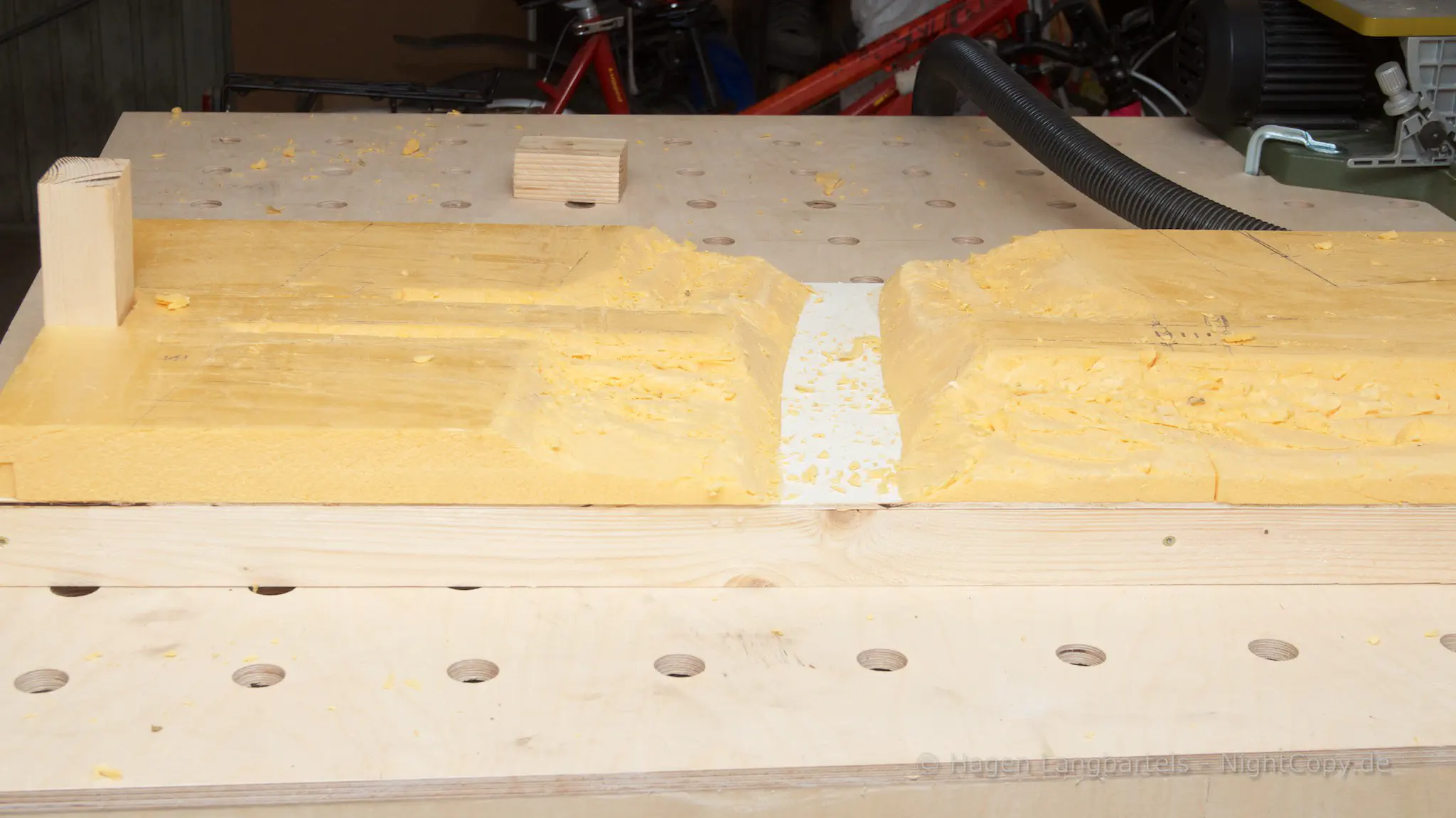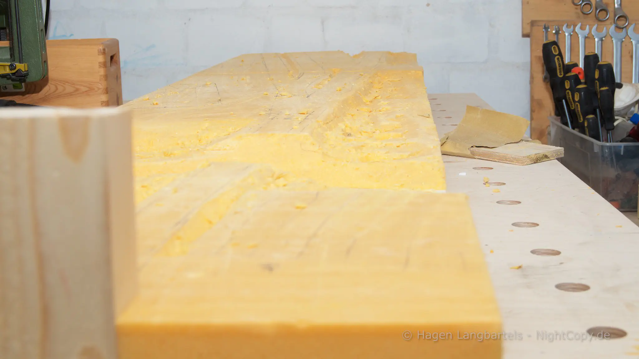 I drew the planed positiones of structures, hills and track onto the foam and started to carve some landscape out of the planes. After that I added some additional layers of foam for the hill on the left of the layout.