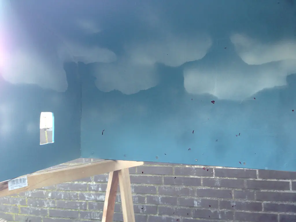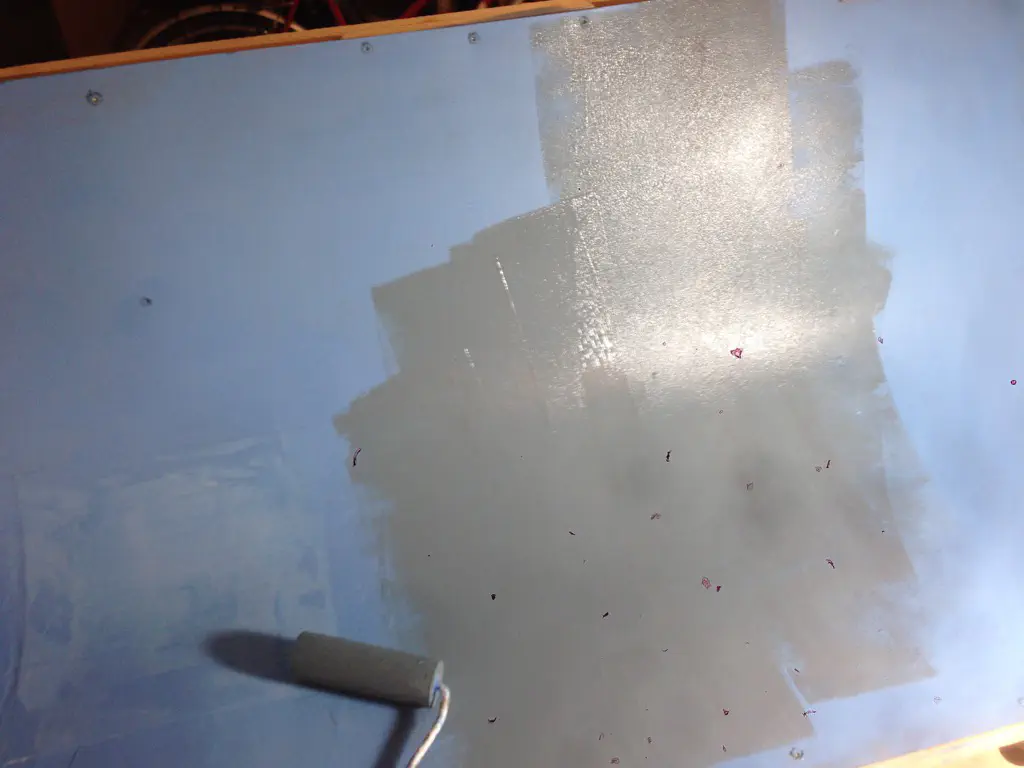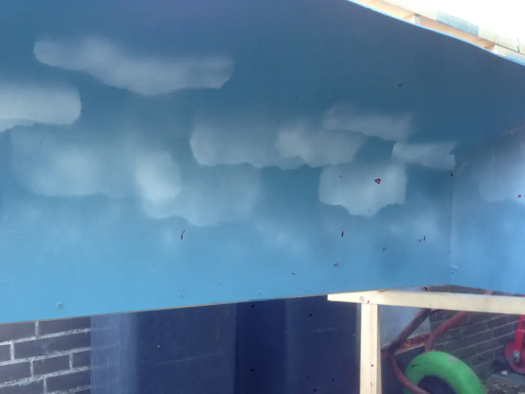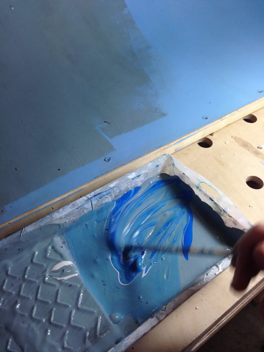 After the backdrop was fixed my daughter and I could move on and paint it. The first color we mixed was pretty blue. Too blue. Thus we added some black and white to tone it down. Now we got a nice blue-gray background which imitates a normal day. Now we may add some clouds.
