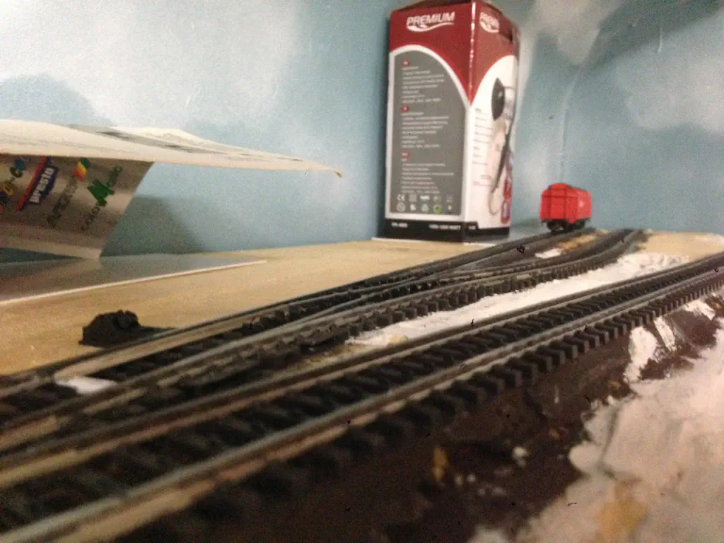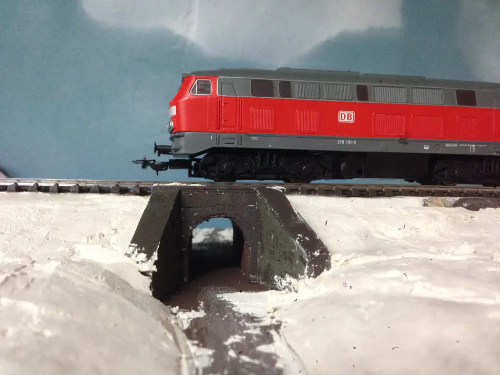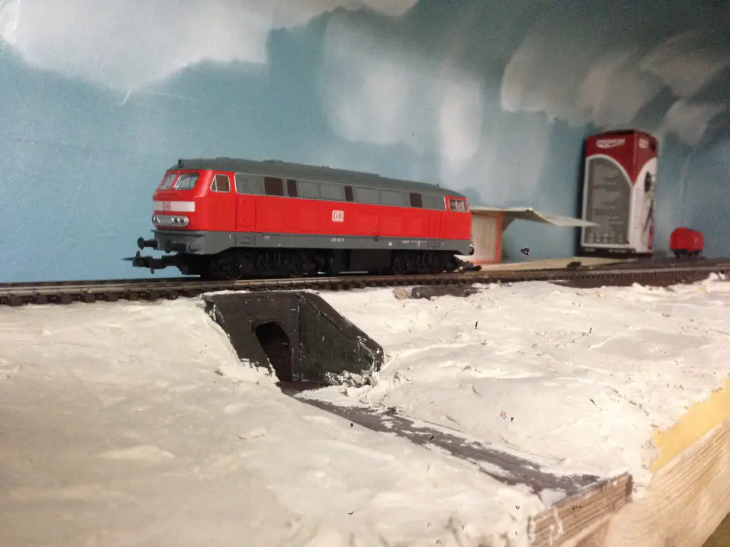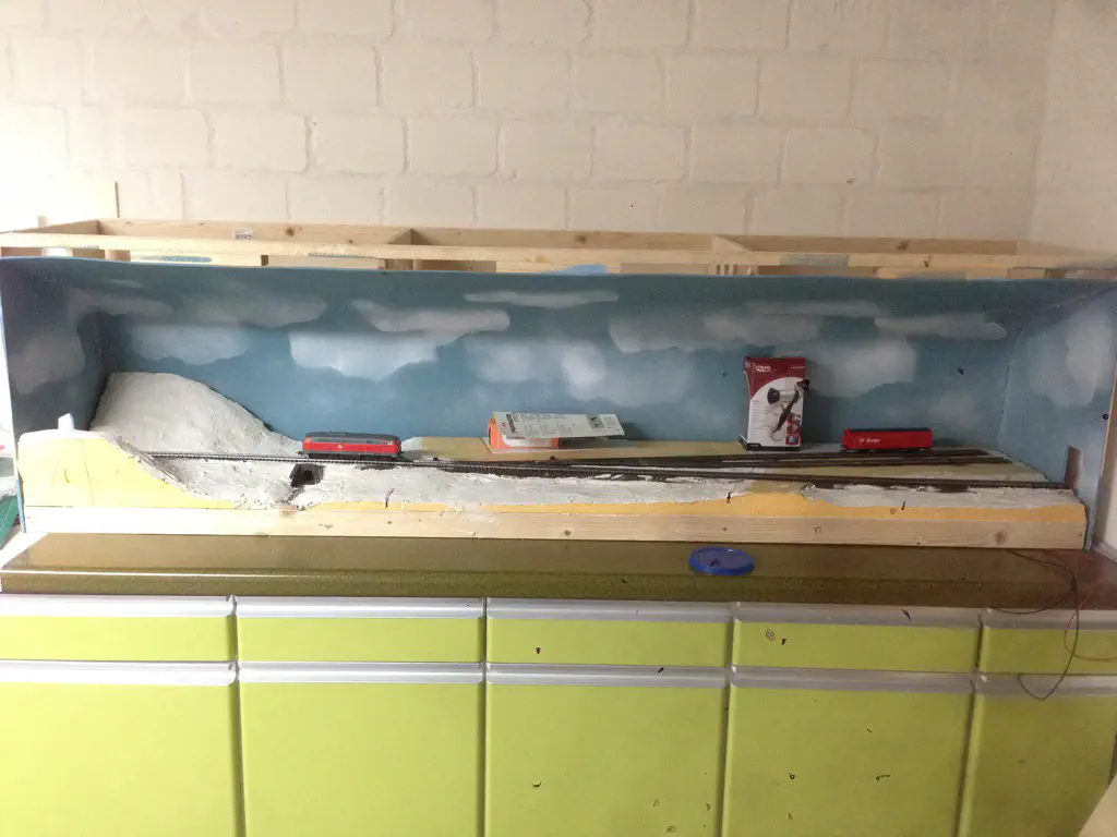 After the paint dried, we created some paper stencils for the clouds. We tried spraying the clouds as I remember seeing in TMTV Juli 2014. I guess we did reuse the same stencil to often. Additionally the spray can was too small and didn’t work very clean. My wife doesn’t like the look of the clouds and thinks they look to uniform. May be we will repaint the backdrop and the clouds later but for now they will stay. Regarding the photos: The camera of my iPhone has collected some dirt, so all the dark fringes in the fuzz in the pictures is not used as backdrop color 😉