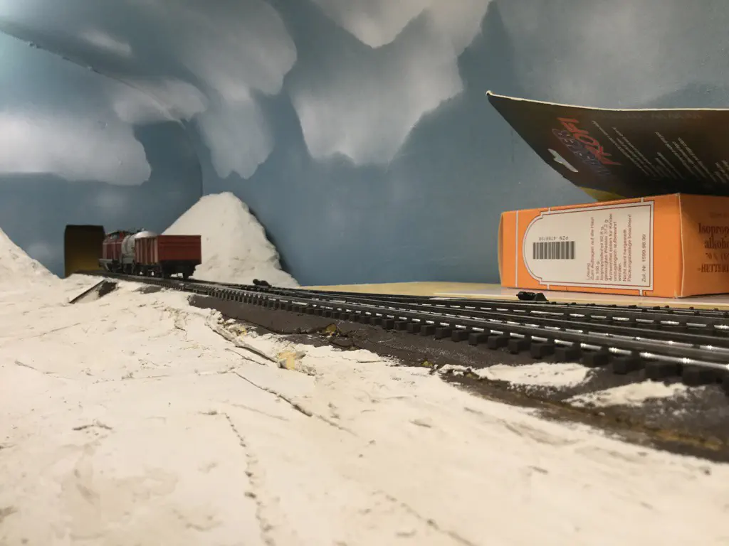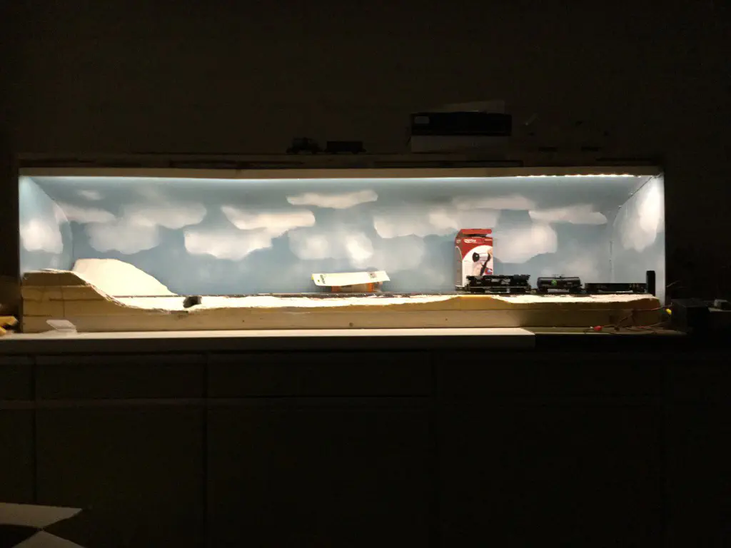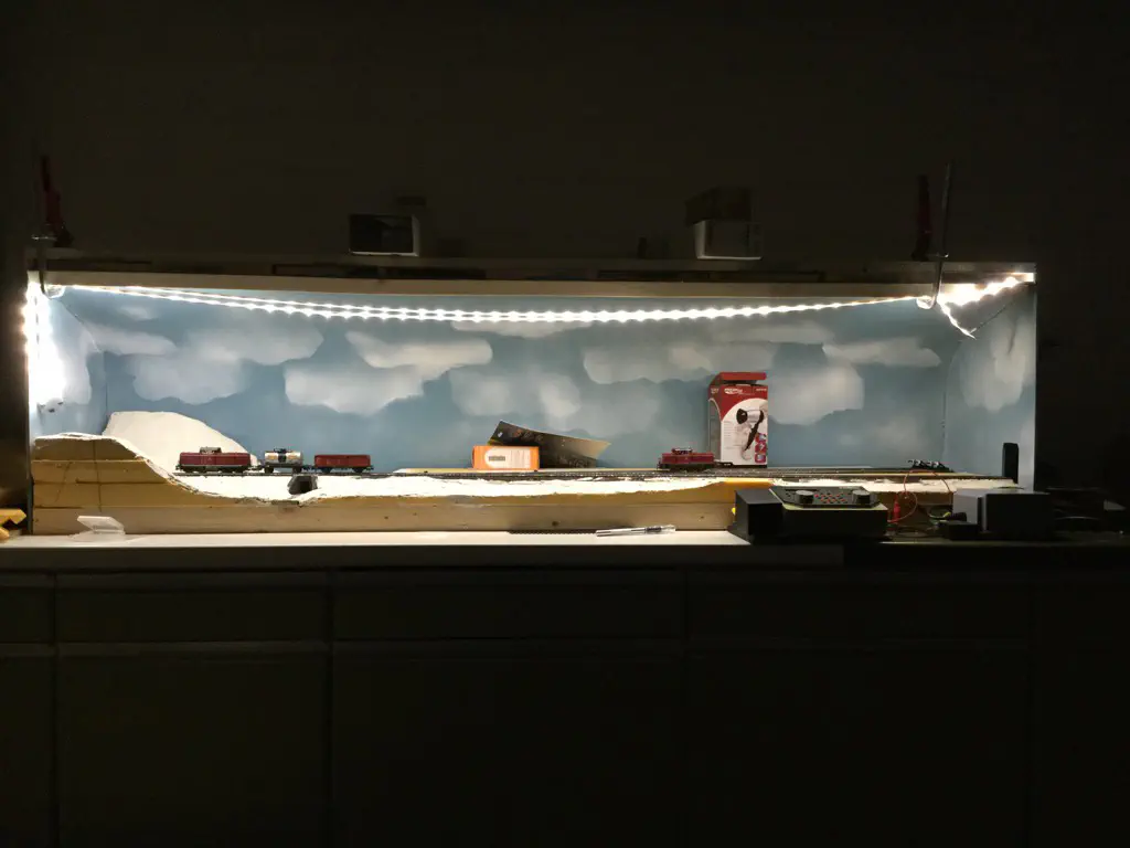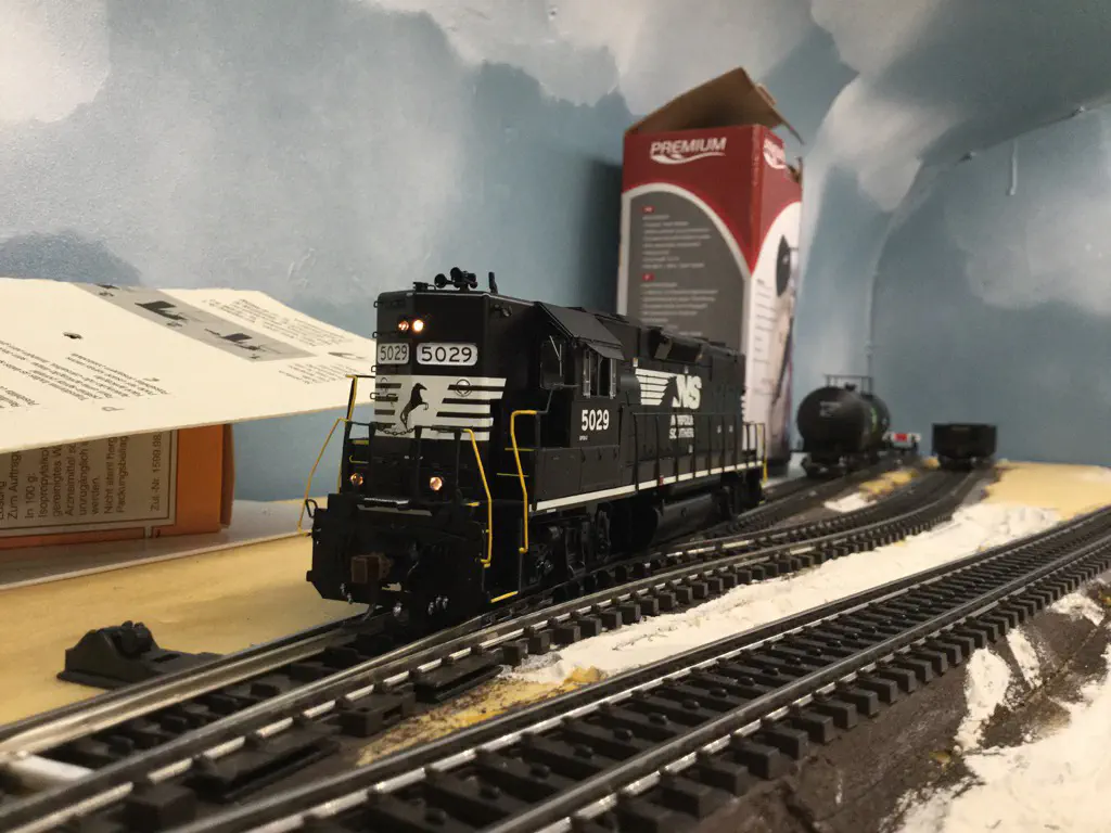 I was quite satisfied with the results and fixed the LEDs in place. After the installation I could not resist and had to unpack my lovely Athearn Genesis GP38-2 and switch some cars. The GP38-2 runs good and sounds great. I used Märklin K-Track with long turnouts. These can be used for the typical “Punktkontakt” (Pukos, third rail in dots) AC locomotives but it can also be used for DC locomotives. Sadly not all DC locomotives can cope with the “Pukos” at the turnouts as they are higher than the outer rails of the track to prevent any shorts. Sadly this locomotive seems to lock up at the Pukos with the couplers. So I could not enjoy a smooth run but nevertheless I am motivated to get this project done and proceed with an US switching layout as my next project.