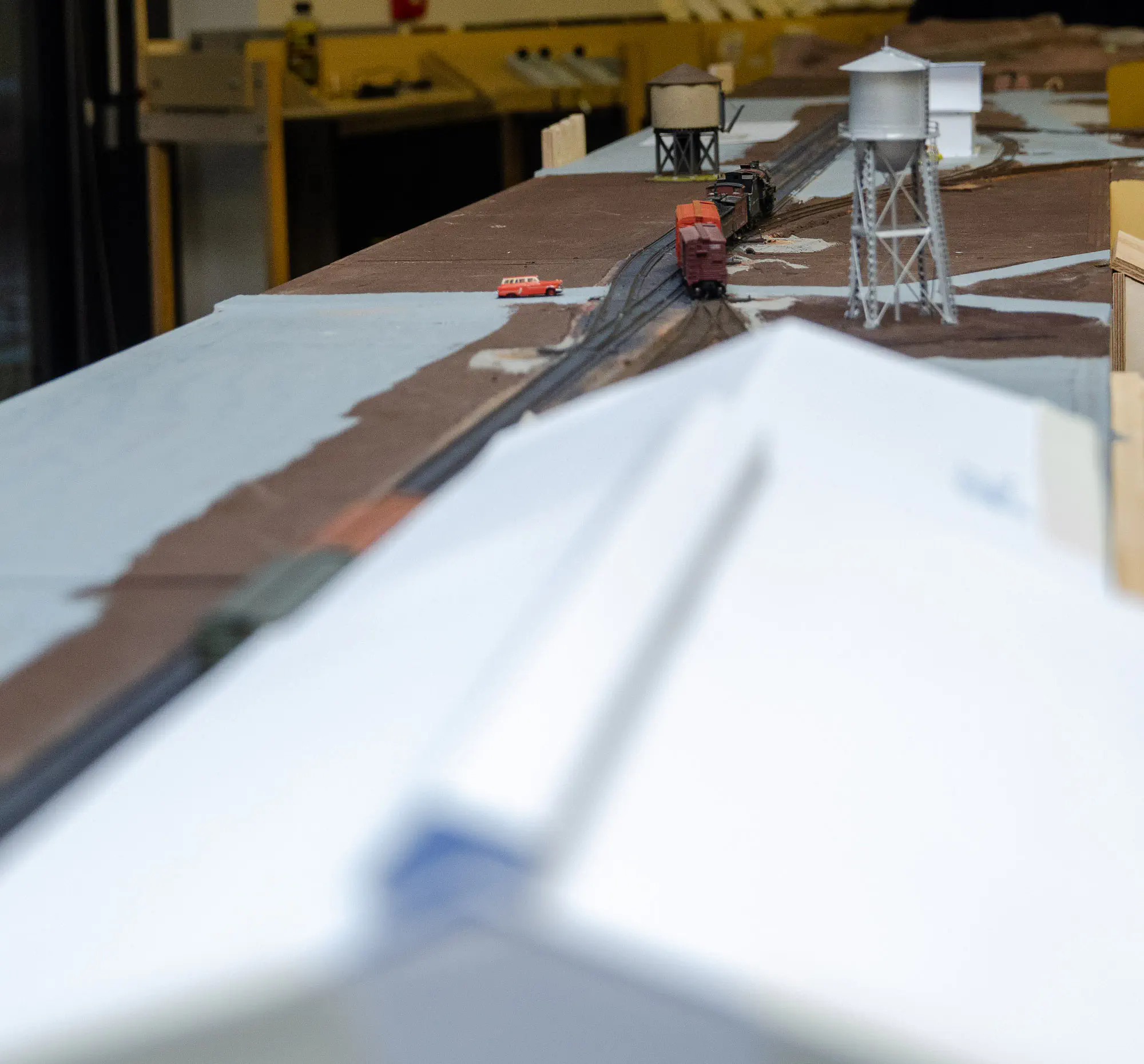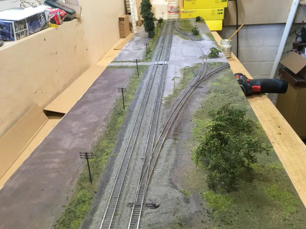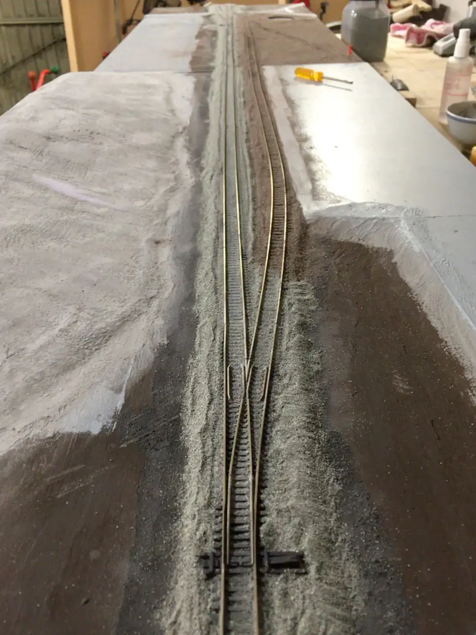 After woodworking it was time time to add ballast to the track and cover the plywood pacific with something that does a better job in imitating nature.