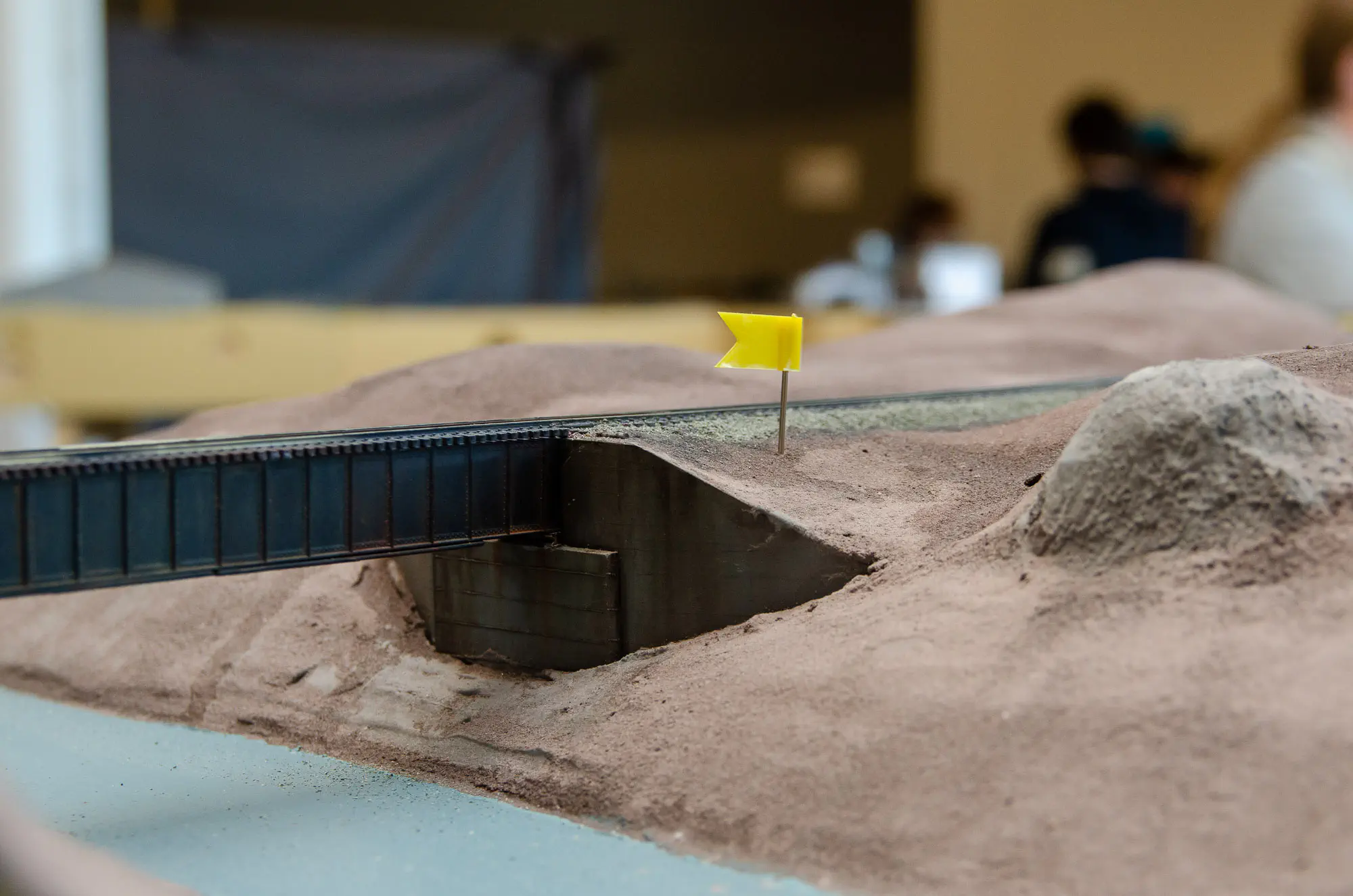 First I painted the surface in colors to match the later usage (brown for dirt and grass, gray for gravel and roads). The next layer is sprinkled over most areas with colored, flexible gap filling putty (like Lugato Universal-Fuge-Flexibel). You can get it in different sized bags and multiple colors which can be mixed to create an interesting and varied surface cover. The advantage of this material over normal white plaster is the color. If scenery made of plaster breaks the damage is highlighted by the white color. With colored material damages are not as obvious. And during the transport, setup and break down of modular layouts things break. But most can be fixed.