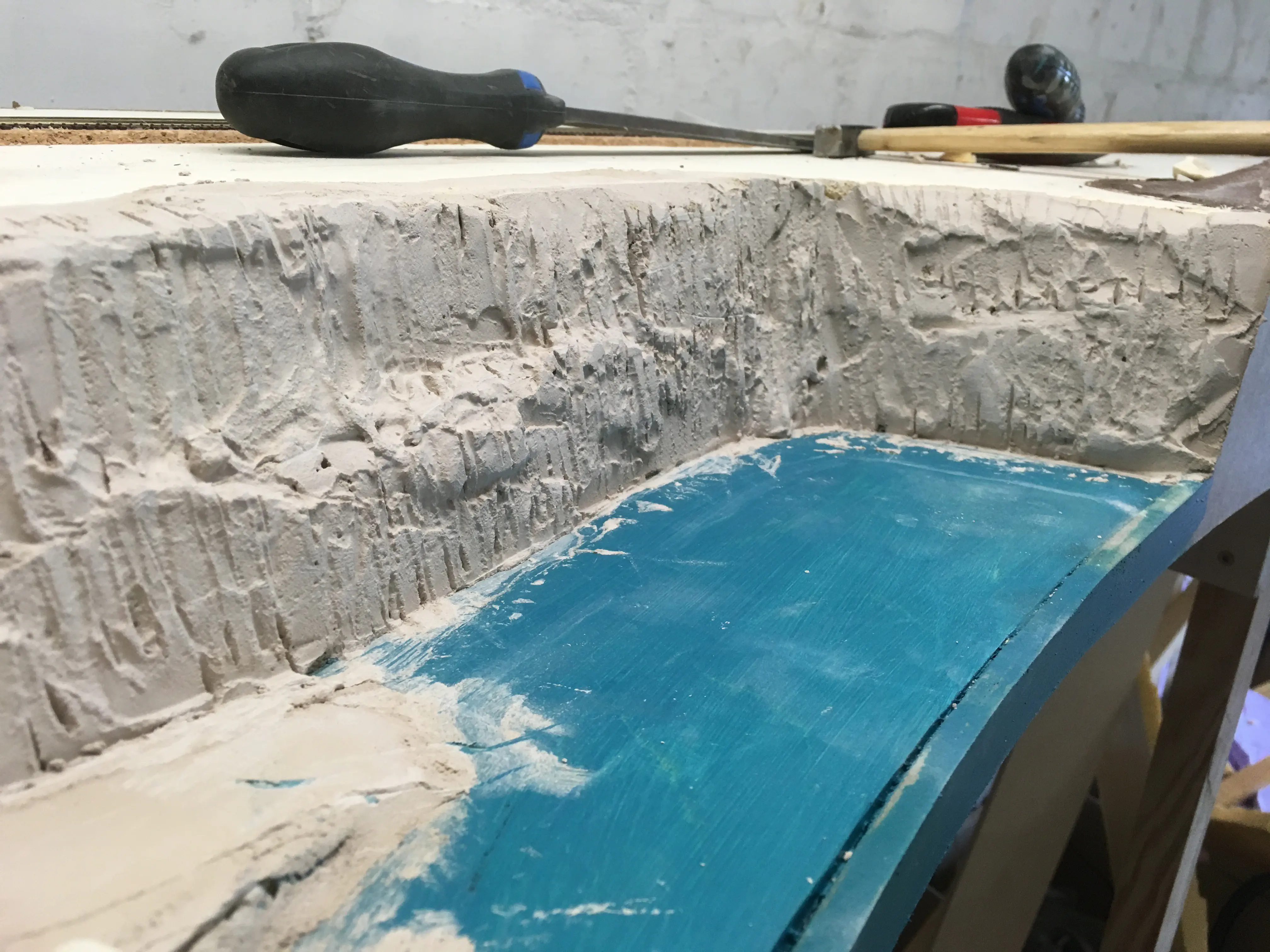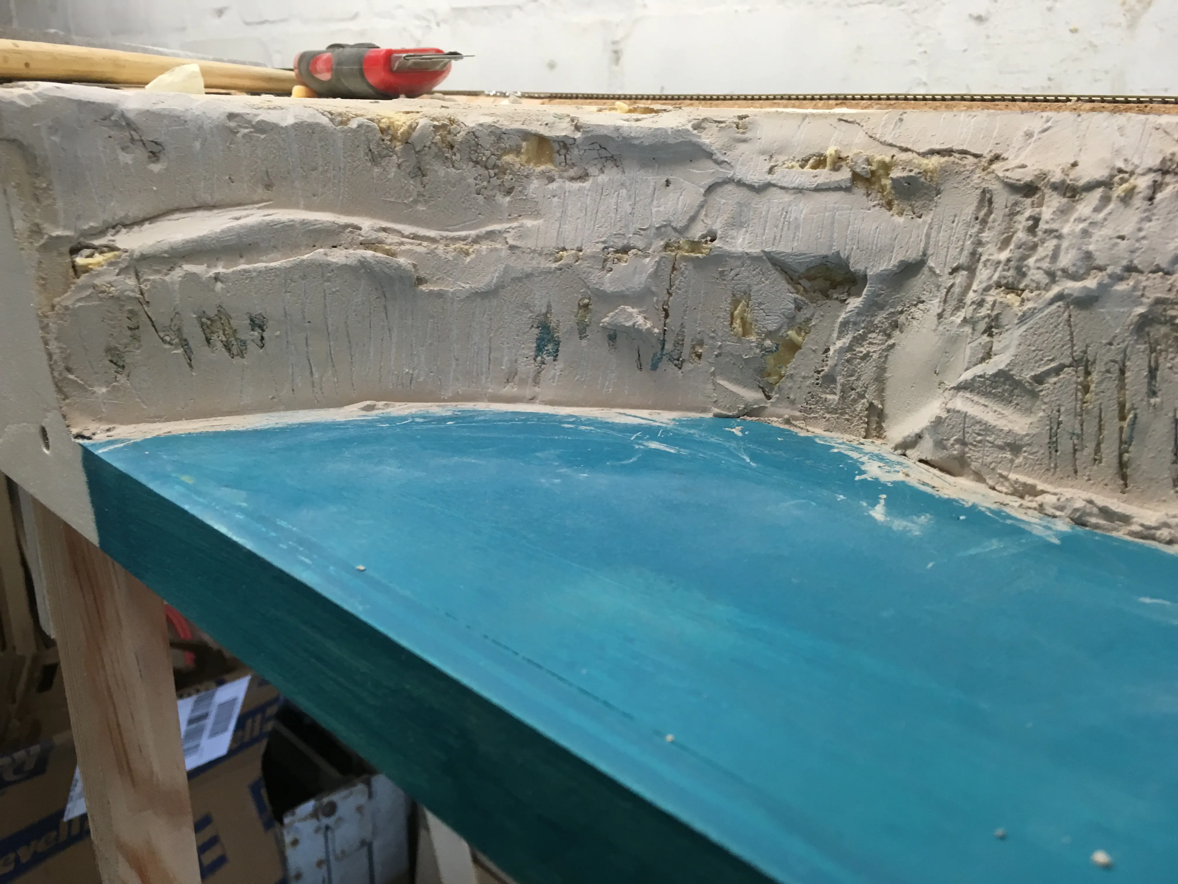 After laying the track I started to create the base of the scenery. As a visual key feature this module should contain flooded quarry pits on two of the segments. A ramp leads from one segment into the first pit on the next segment.