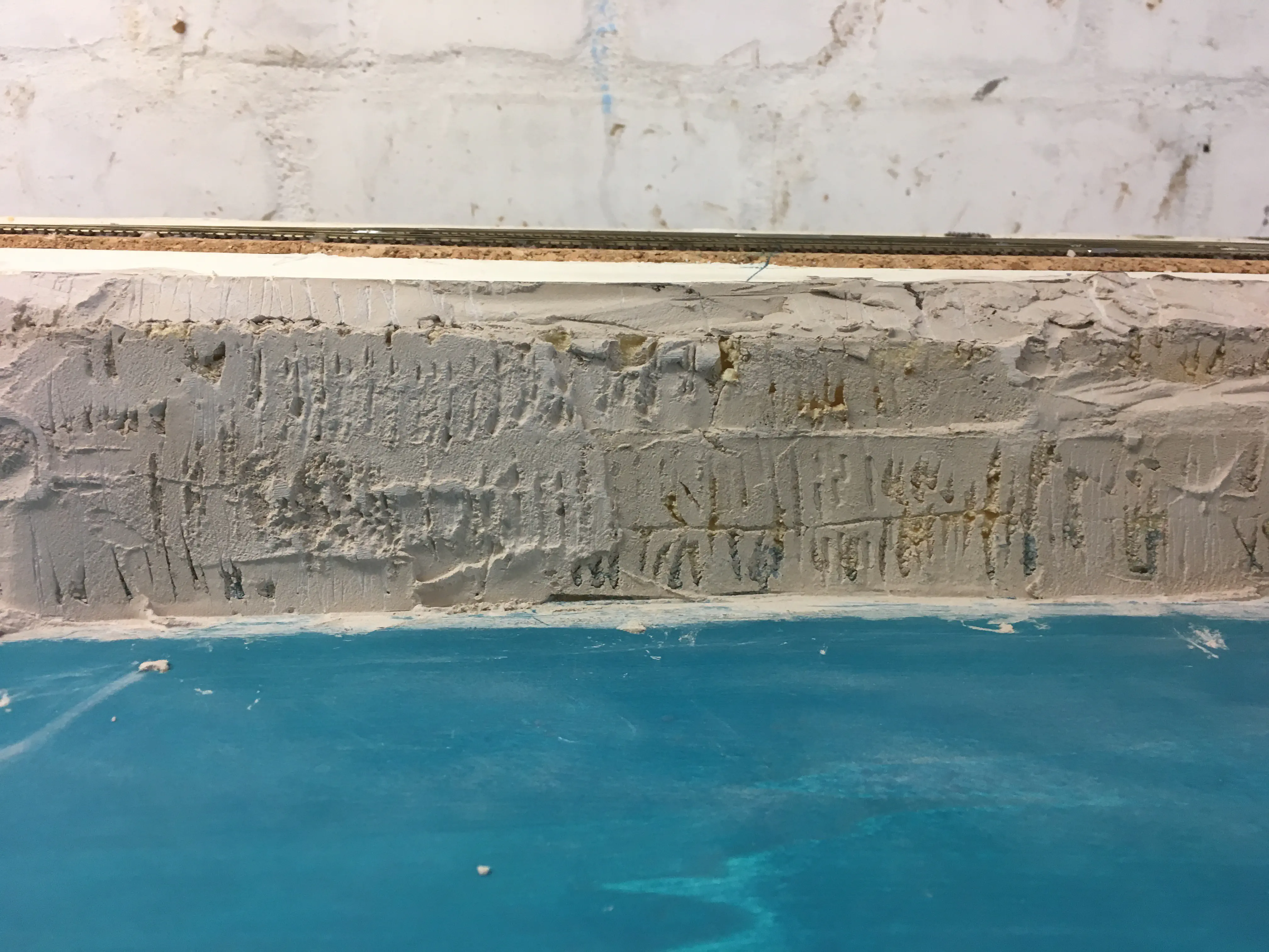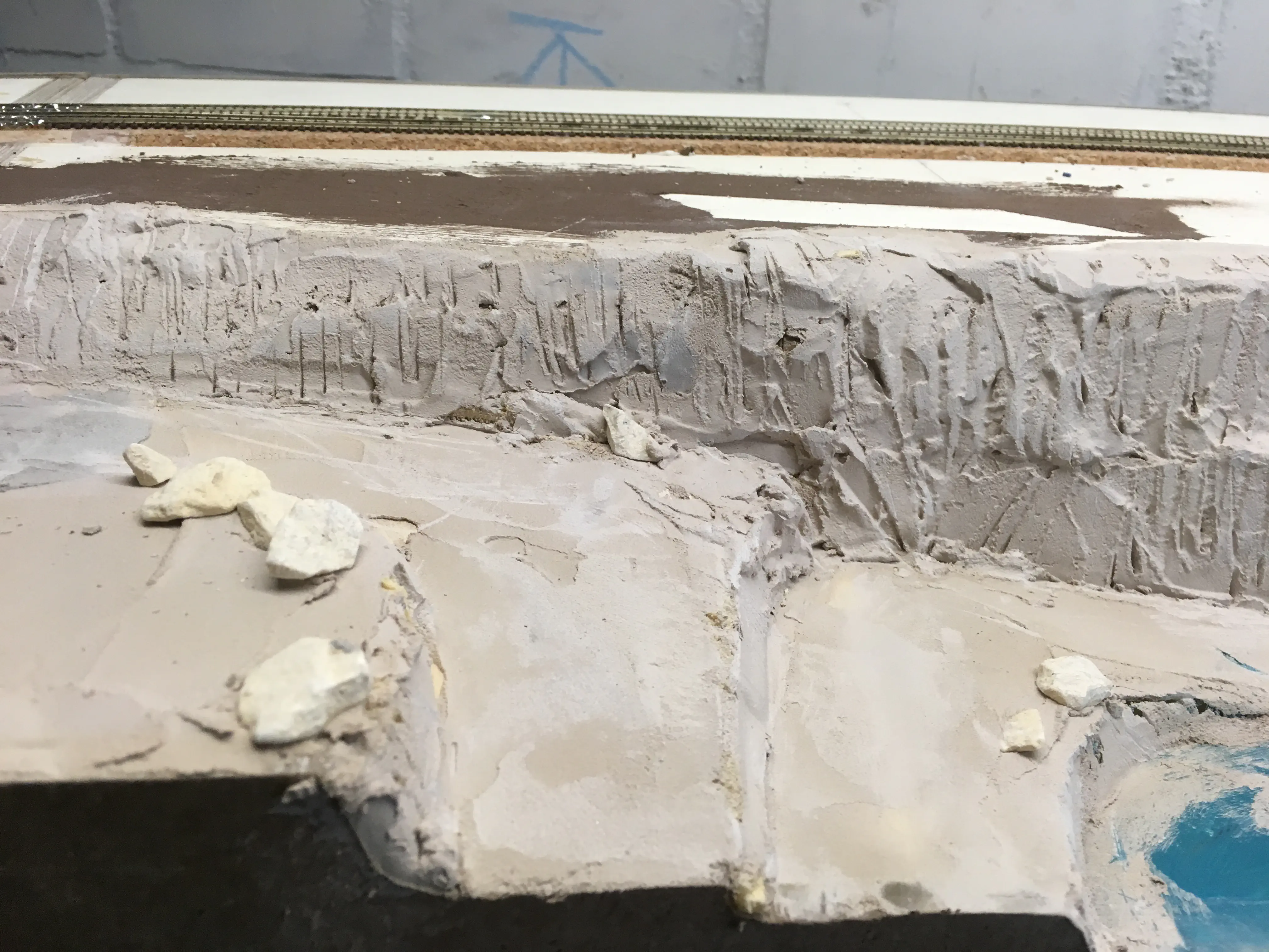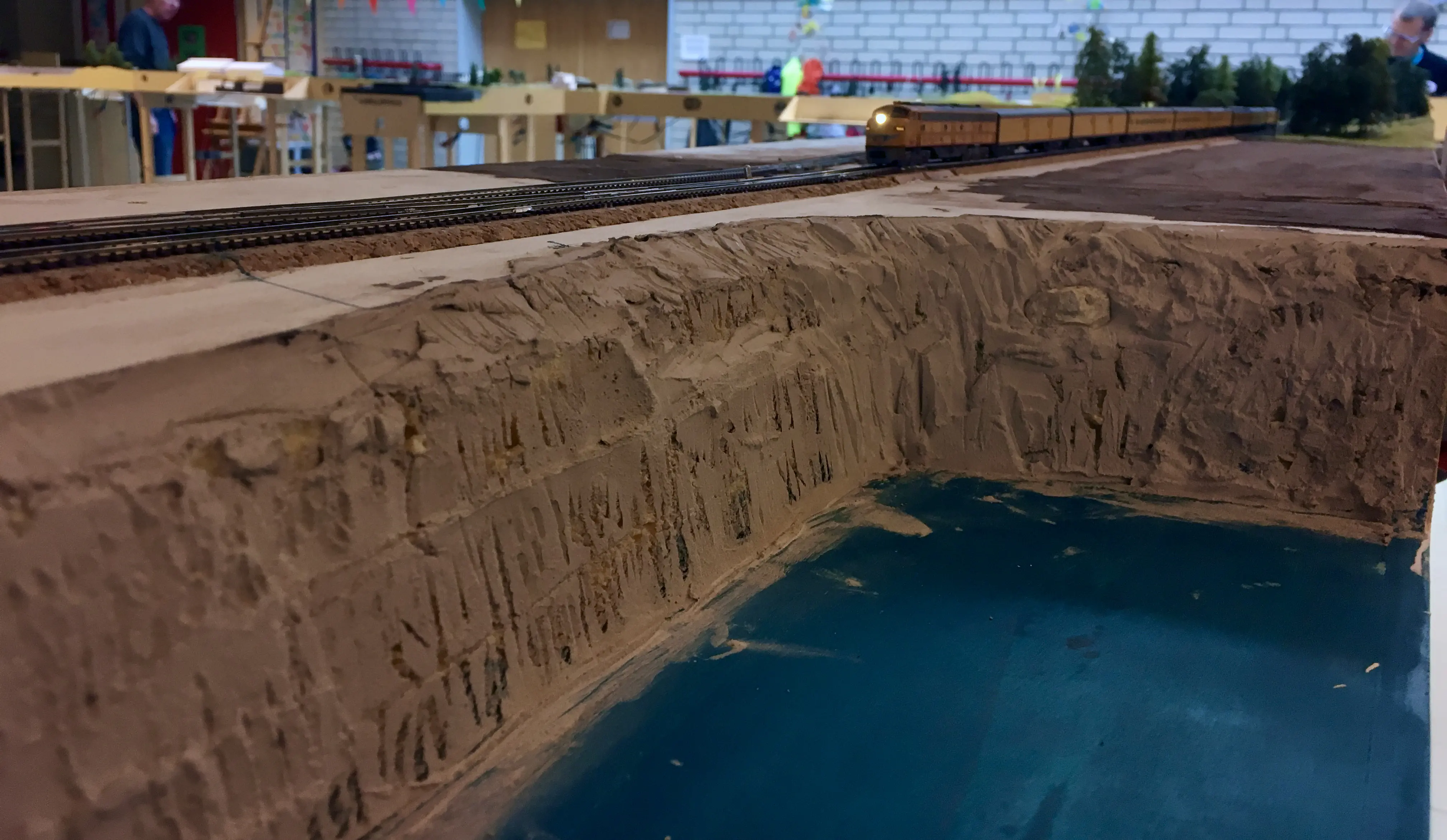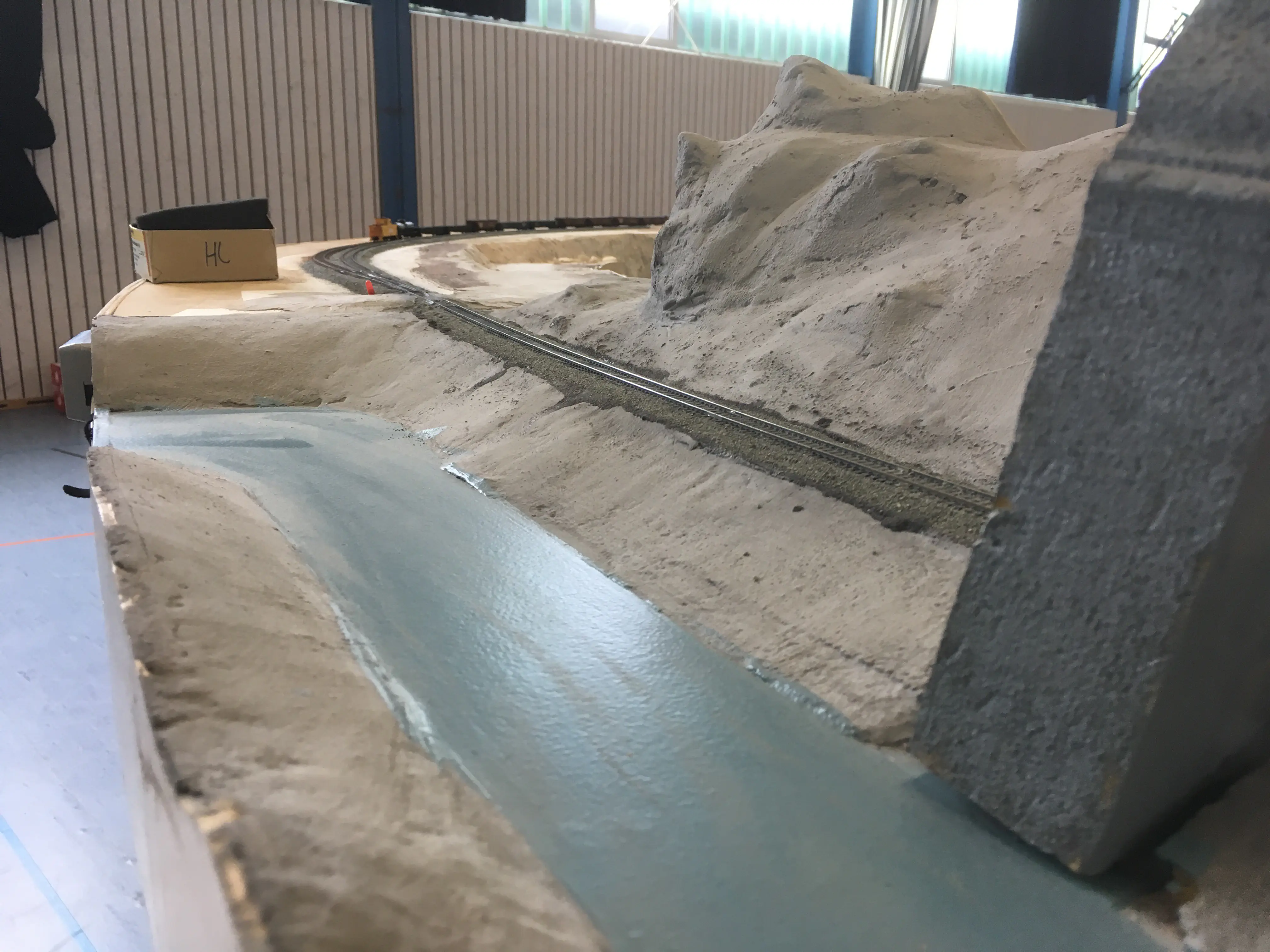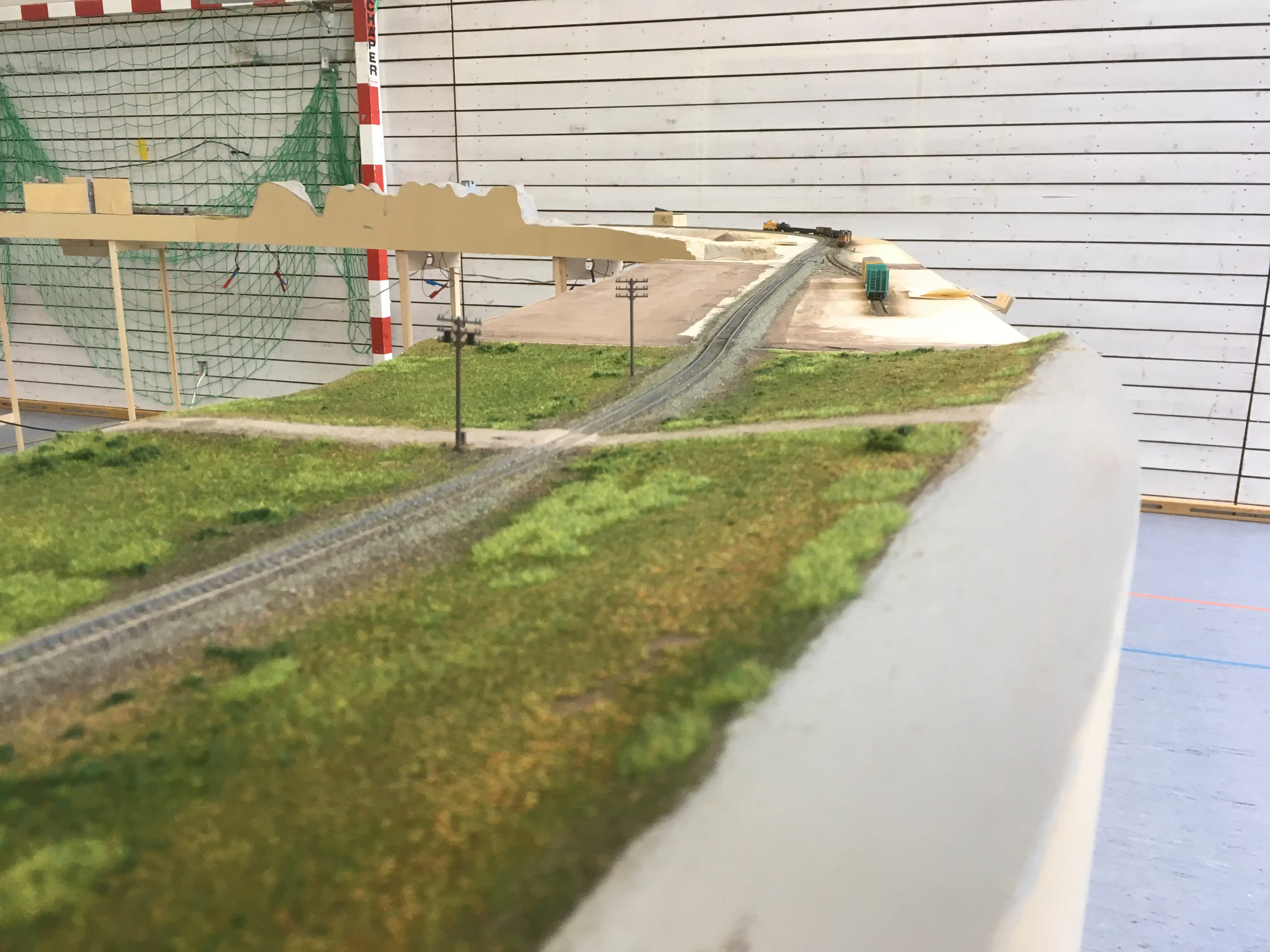Basic scenery for the quarry.The foam is covered using beige plaster and the bottom of the pits is painted in a color that is not too far away from the prototype. This is the state the module was used on its first meeting, only one week later and another meeting in June. Read the report of the americaN-Heidetreffen in Vögelsen in 2017.Here you can find the 2. FREMO US-Treffen Waldenburg 2017 report.