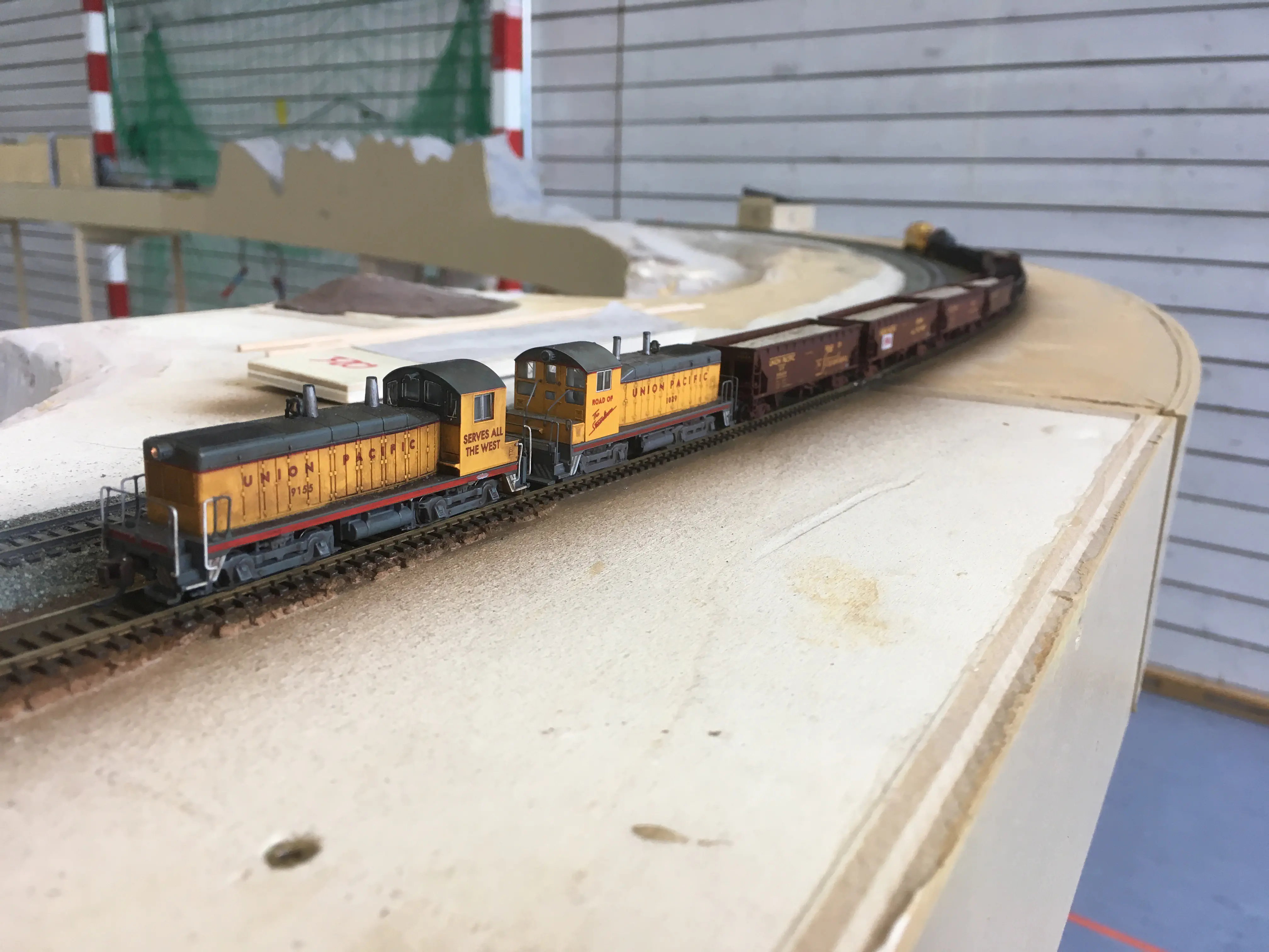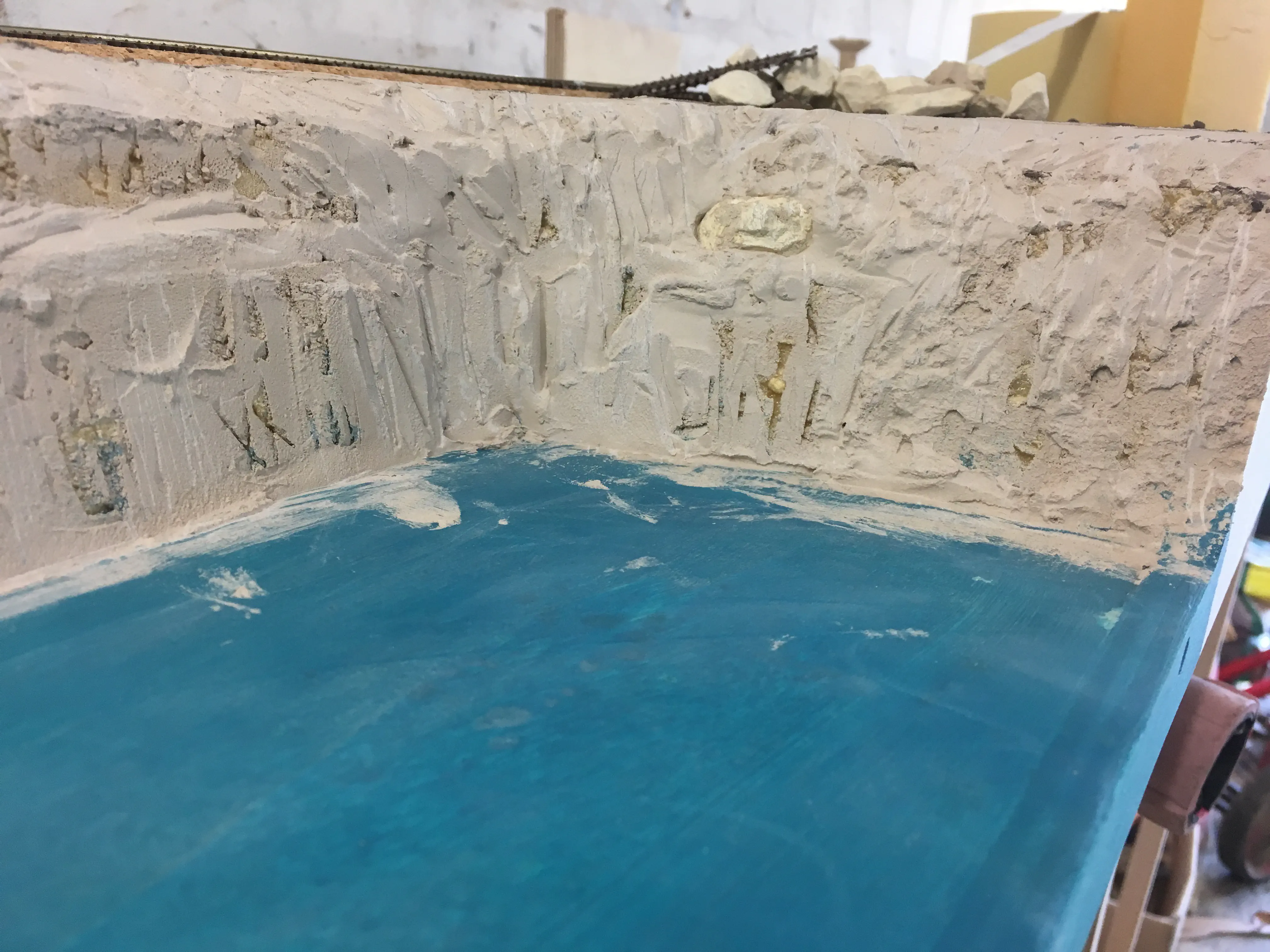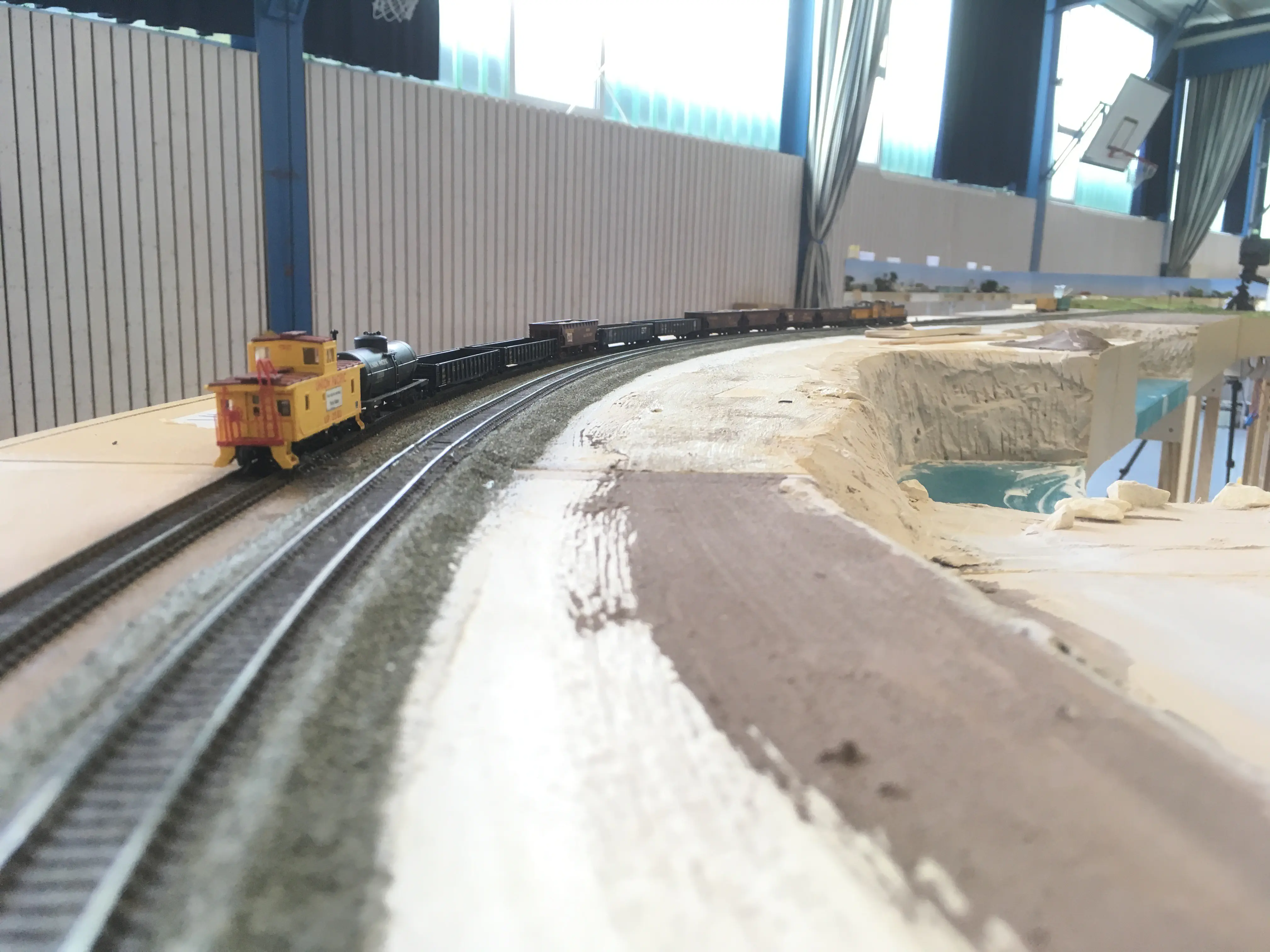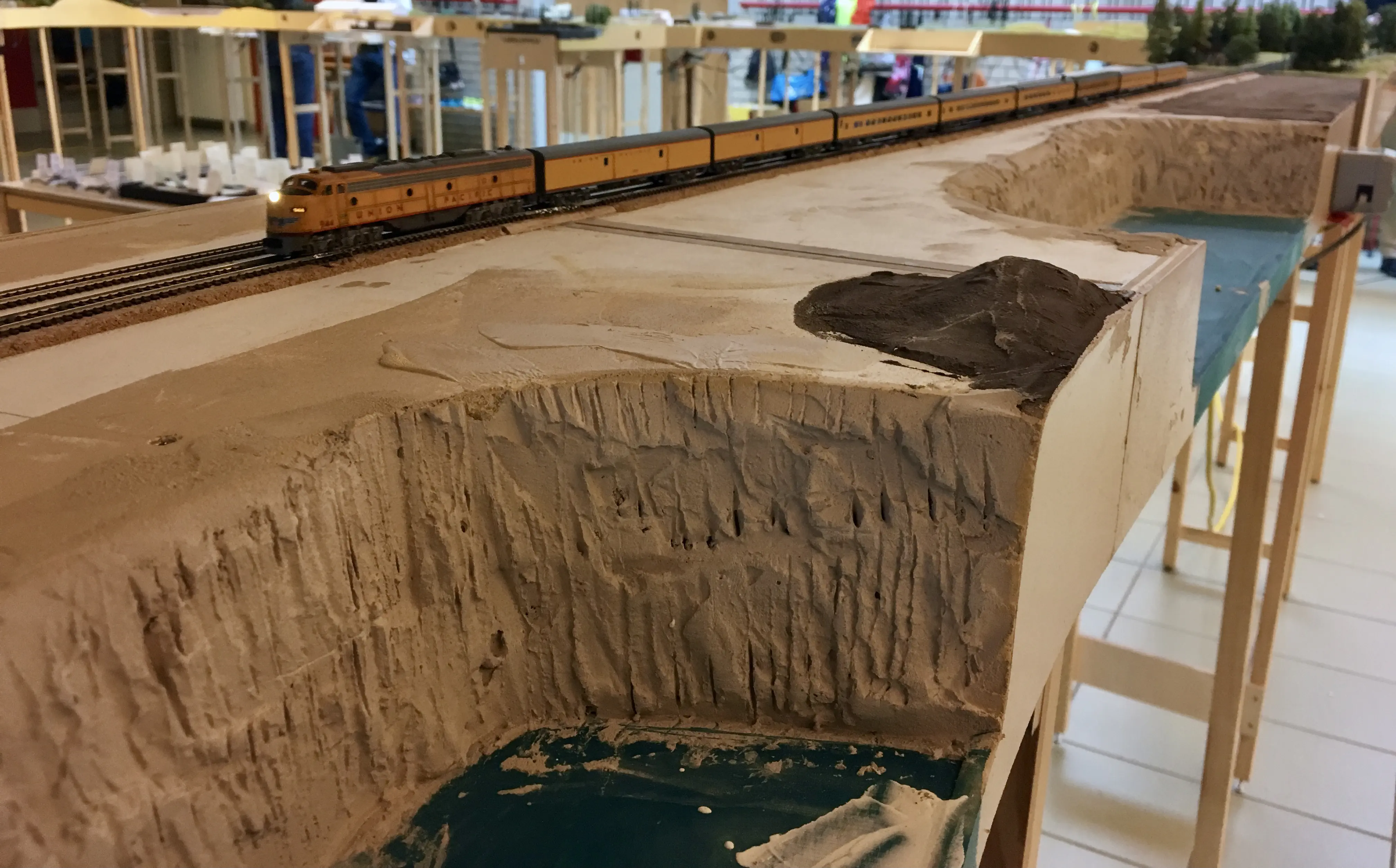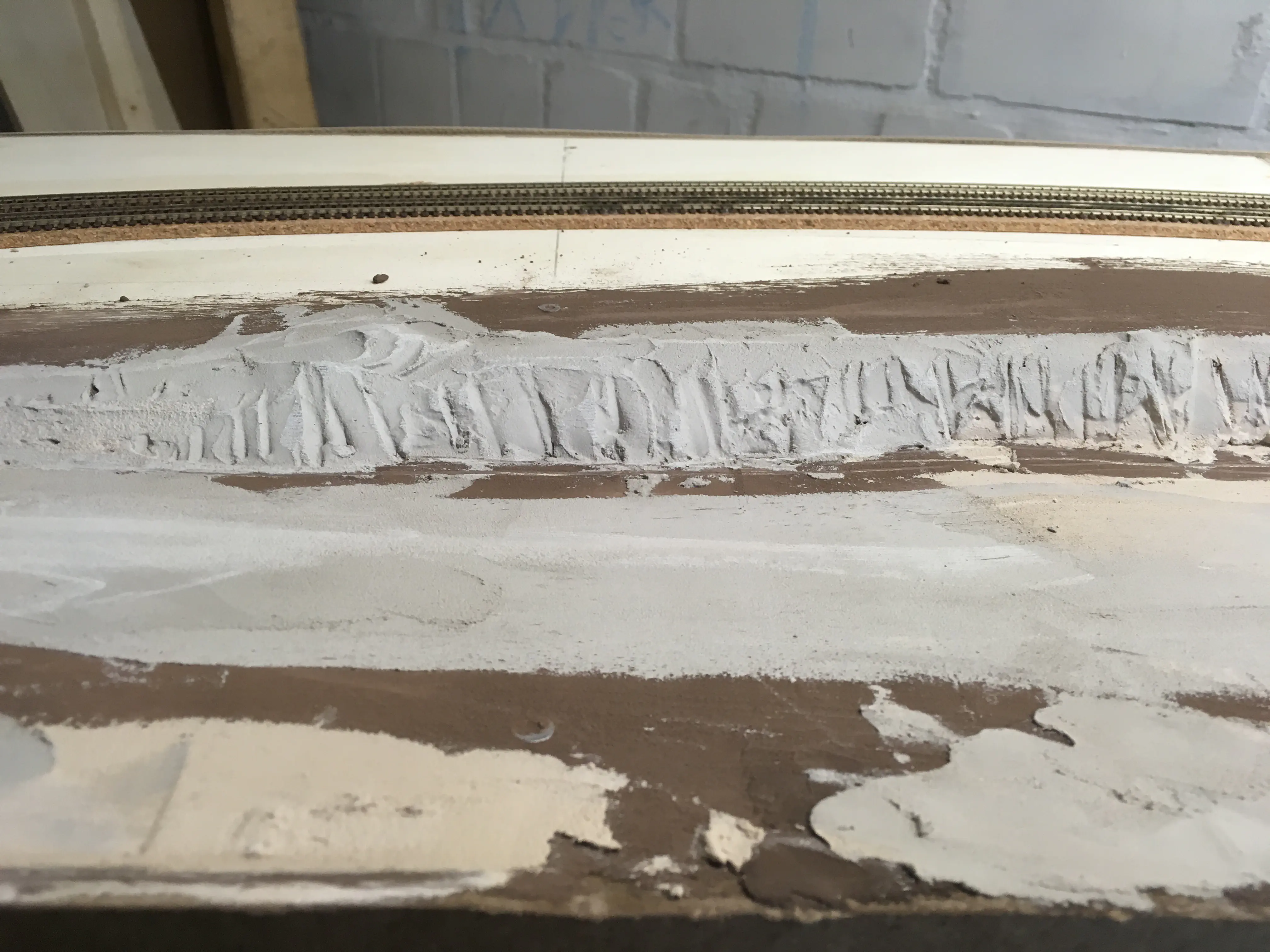 Basic scenery for the quarry.The foam is covered using beige plaster and the bottom of the pits is painted in a color that is not too far away from the prototype. This is the state the module was used on its first meeting, only one week later and another meeting in June. Read the report of the americaN-Heidetreffen in Vögelsen in 2017.Here you can find the 2. FREMO US-Treffen Waldenburg 2017 report.