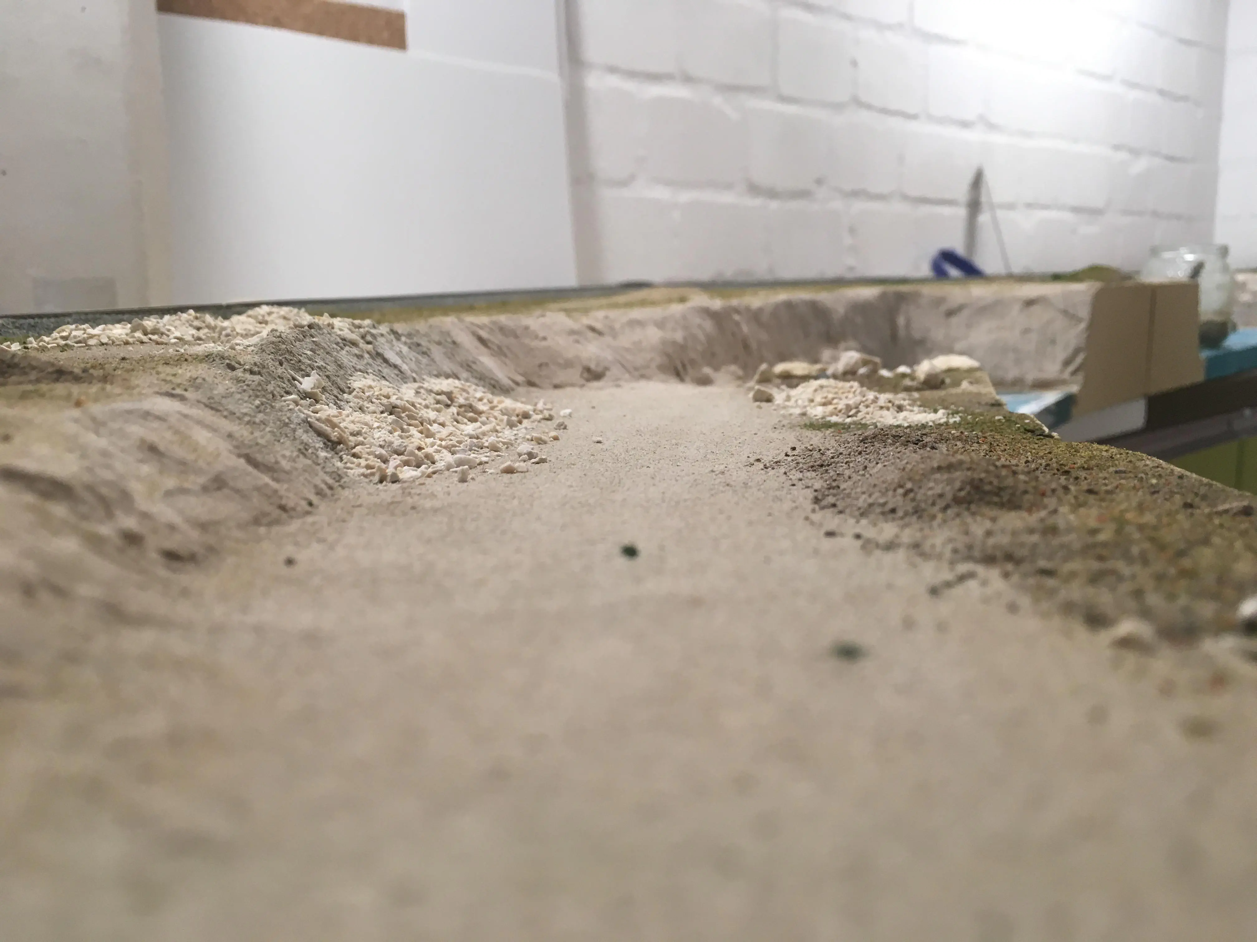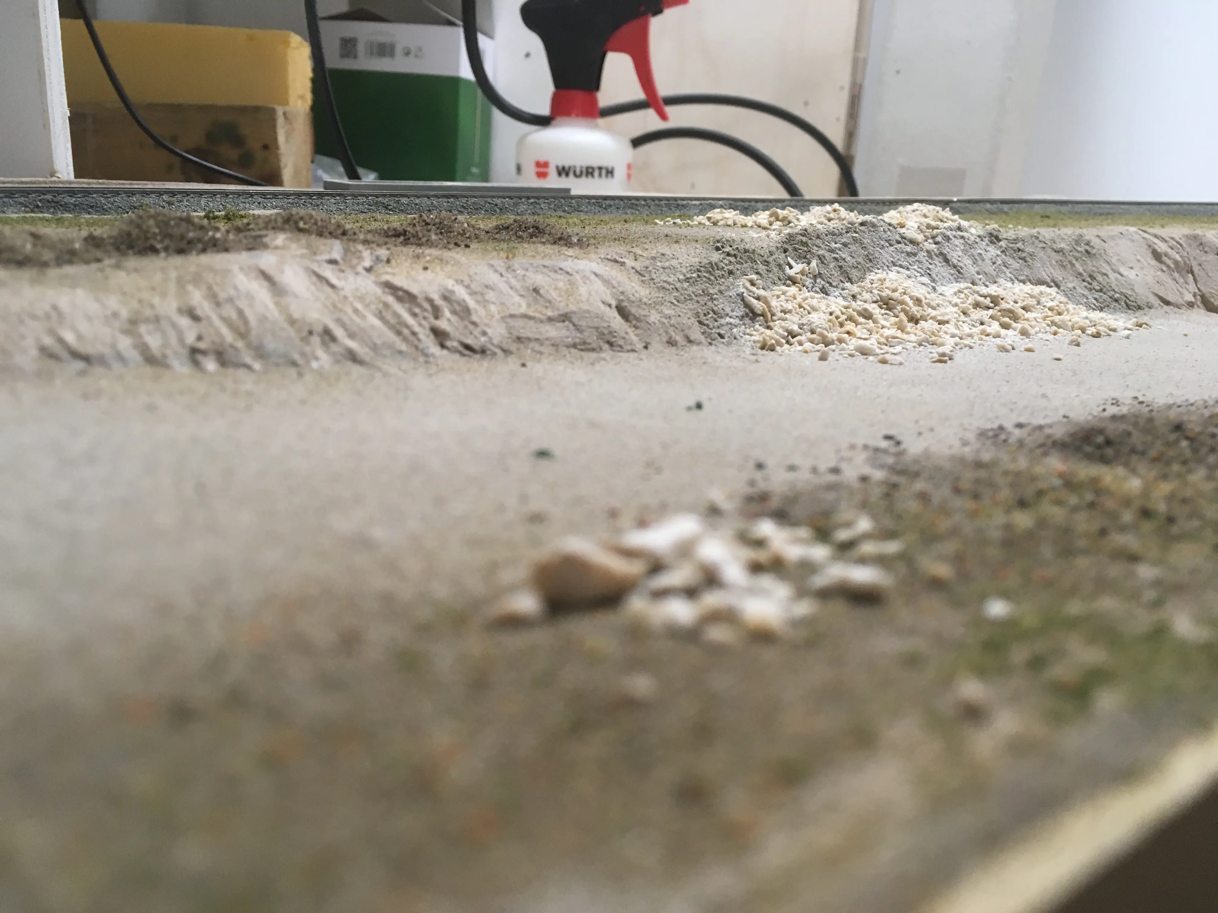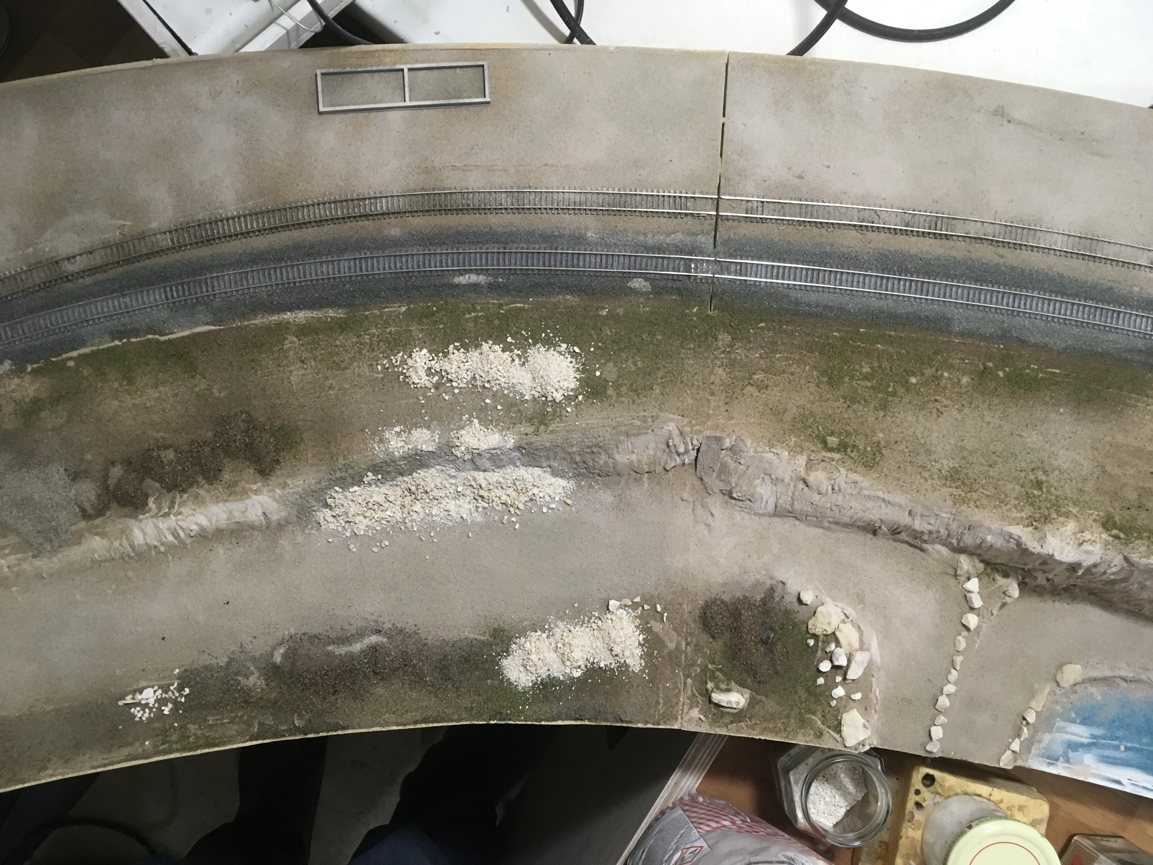 The module has been used at a few meetings in 2017. This month I found the time to continue my work on the landscape. I wanted to mimic the look of an active lime stone quarry, where some rubble has been dumped. But I started with ballasting the track.