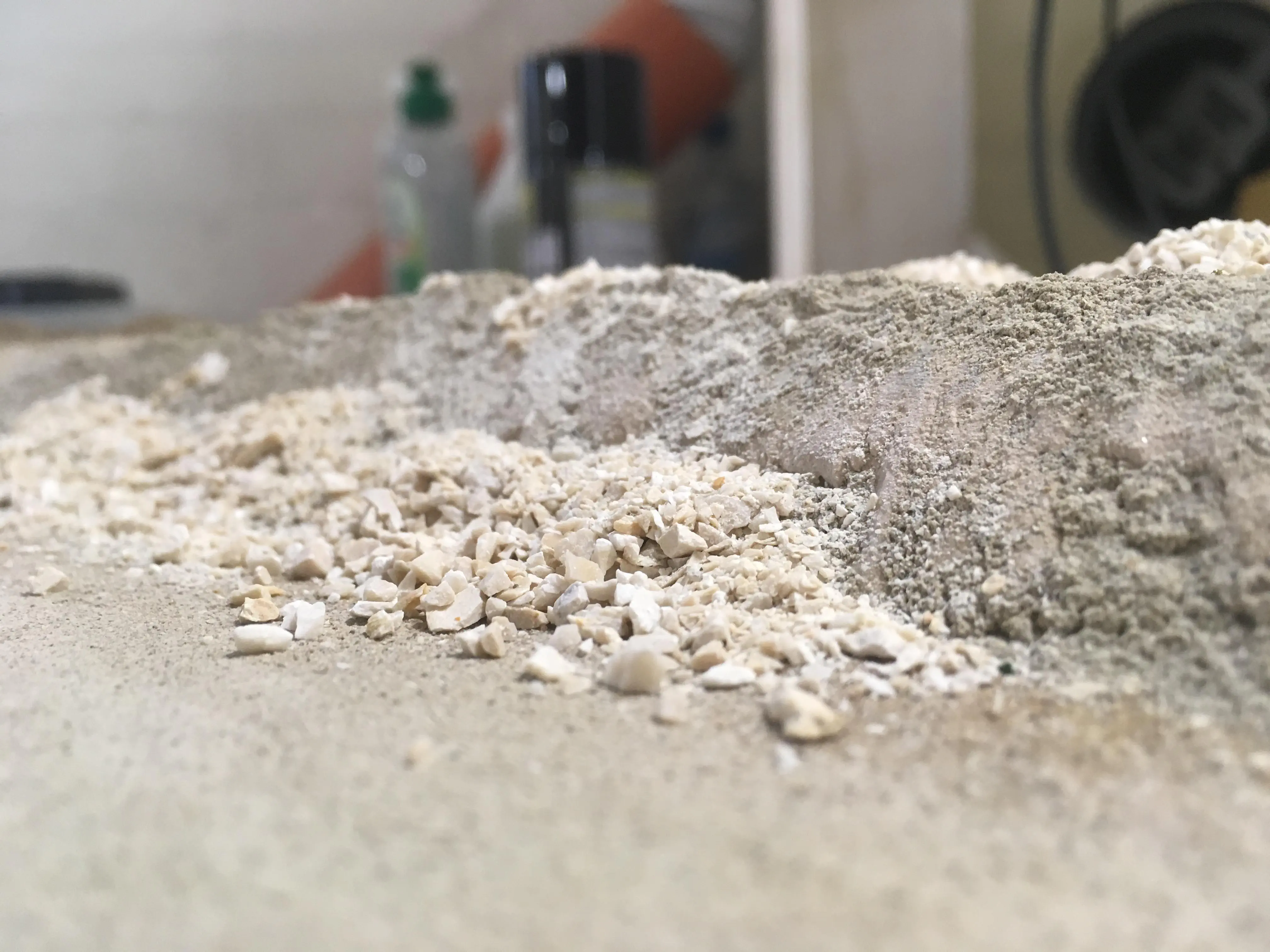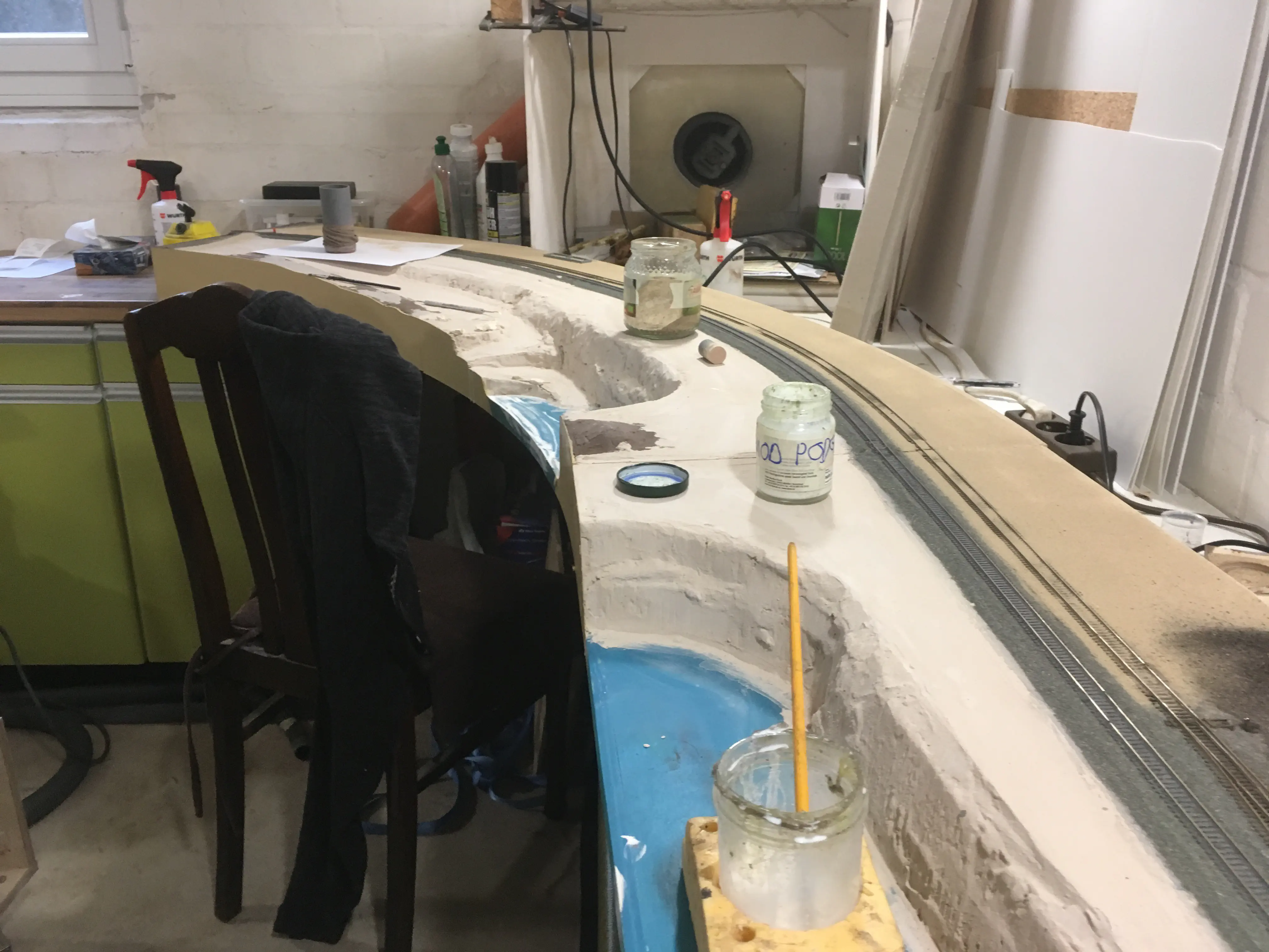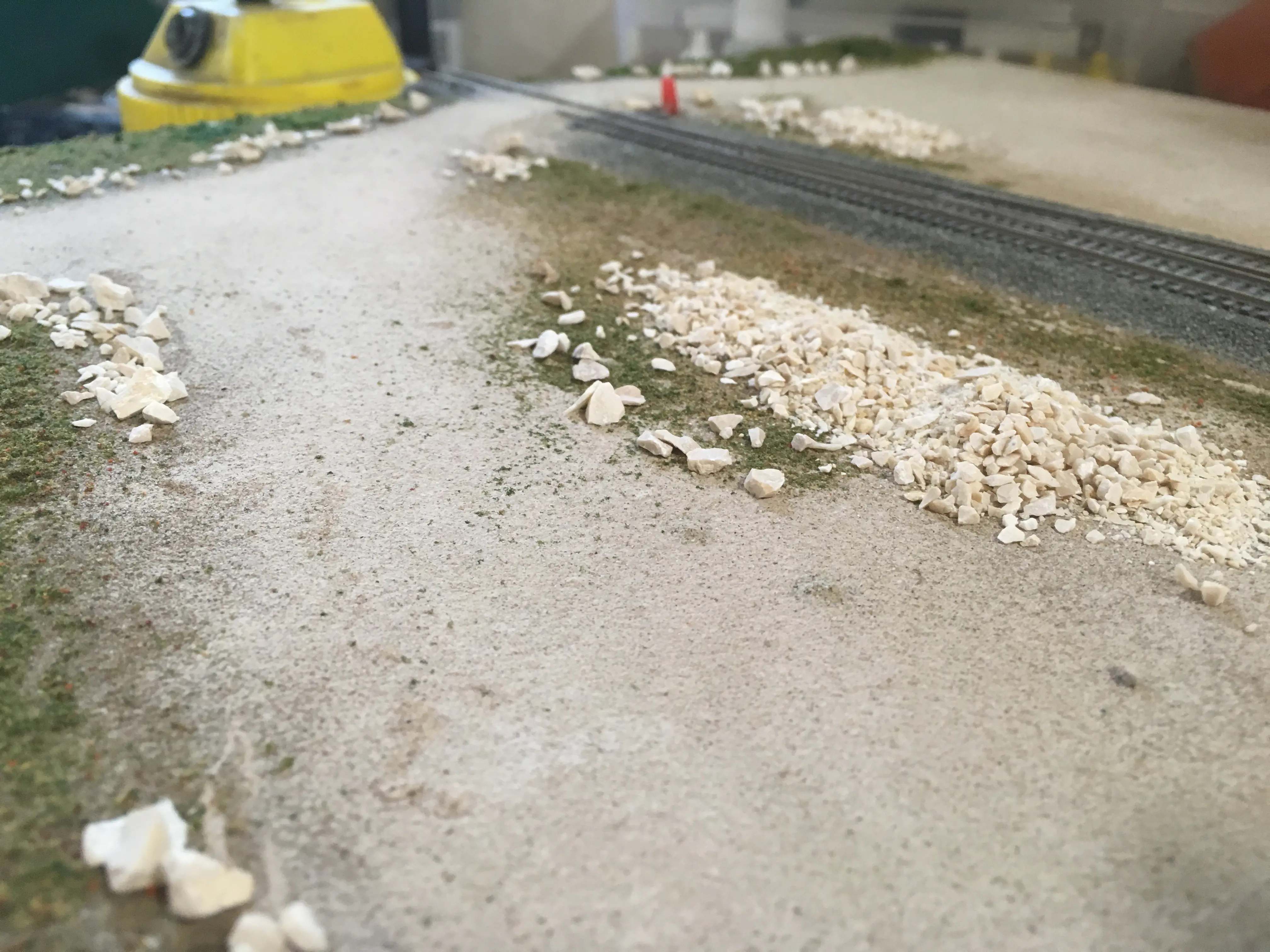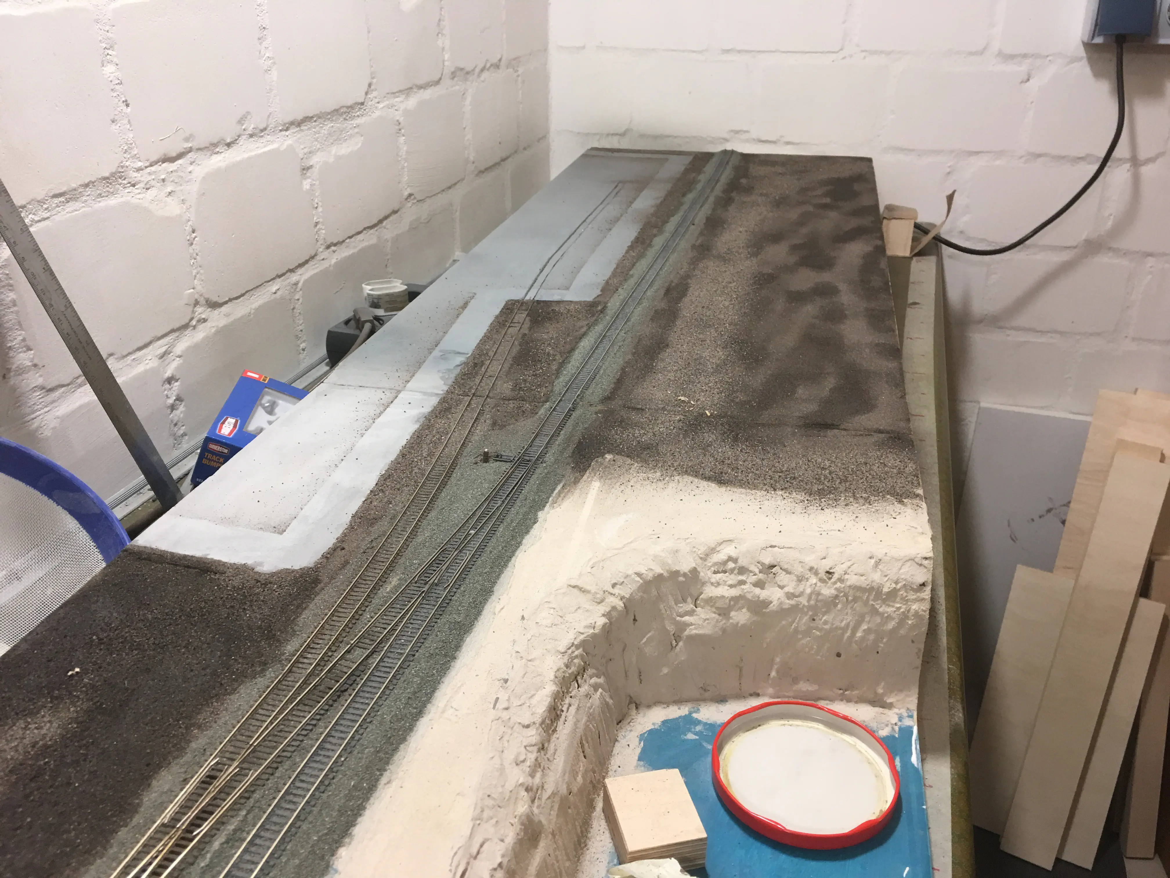 The module has been used at a few meetings in 2017. This month I found the time to continue my work on the landscape. I wanted to mimic the look of an active lime stone quarry, where some rubble has been dumped. But I started with ballasting the track.