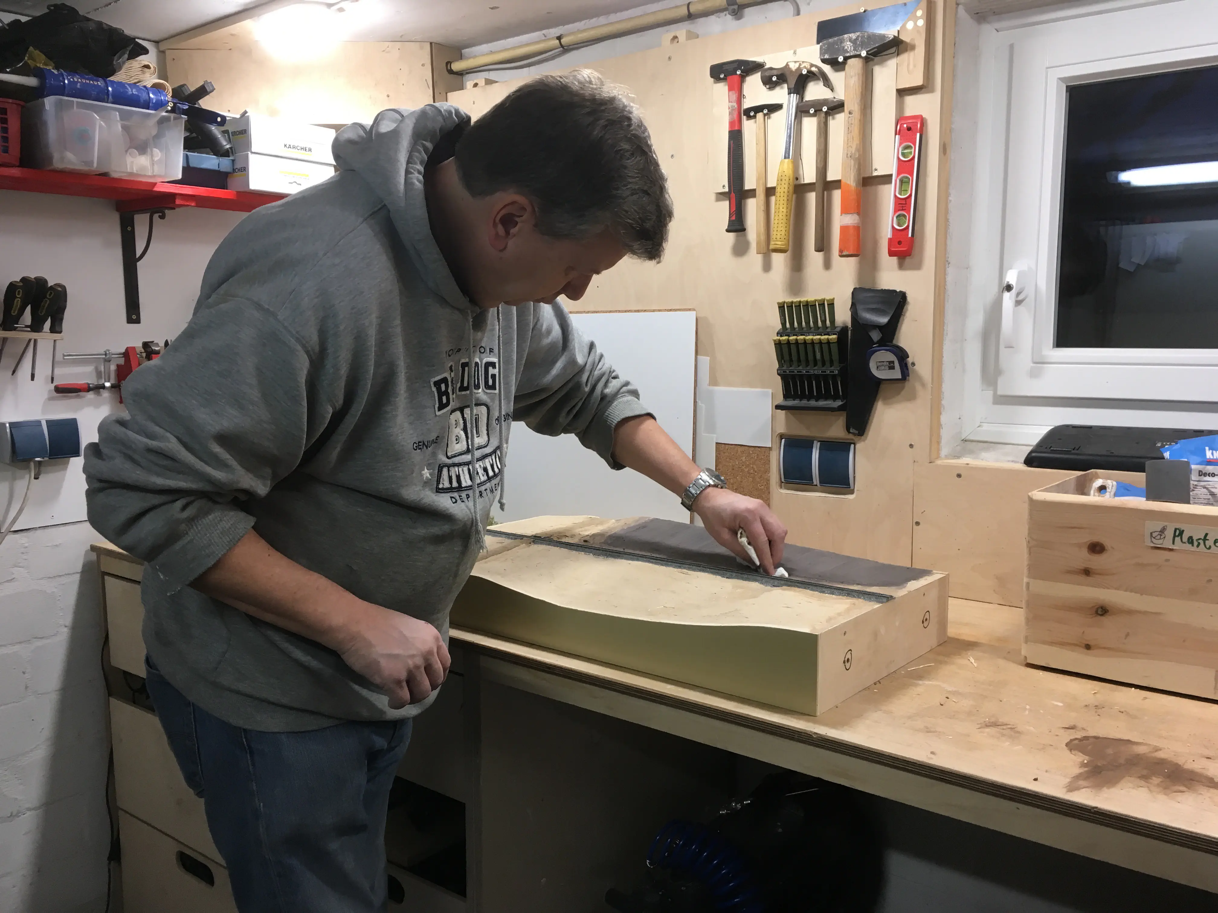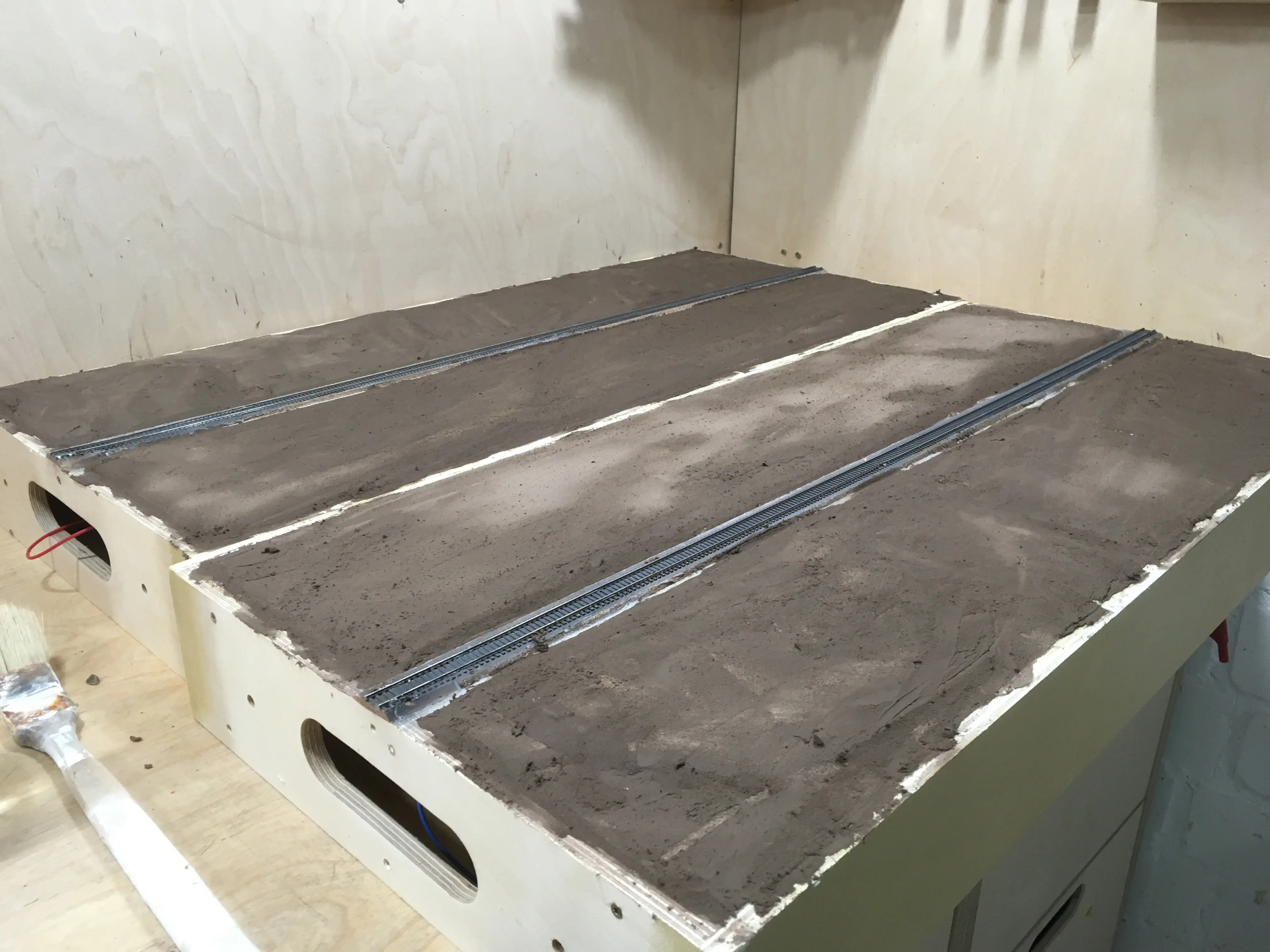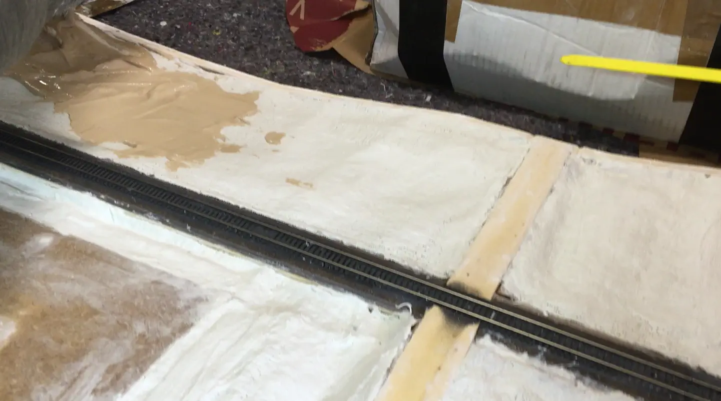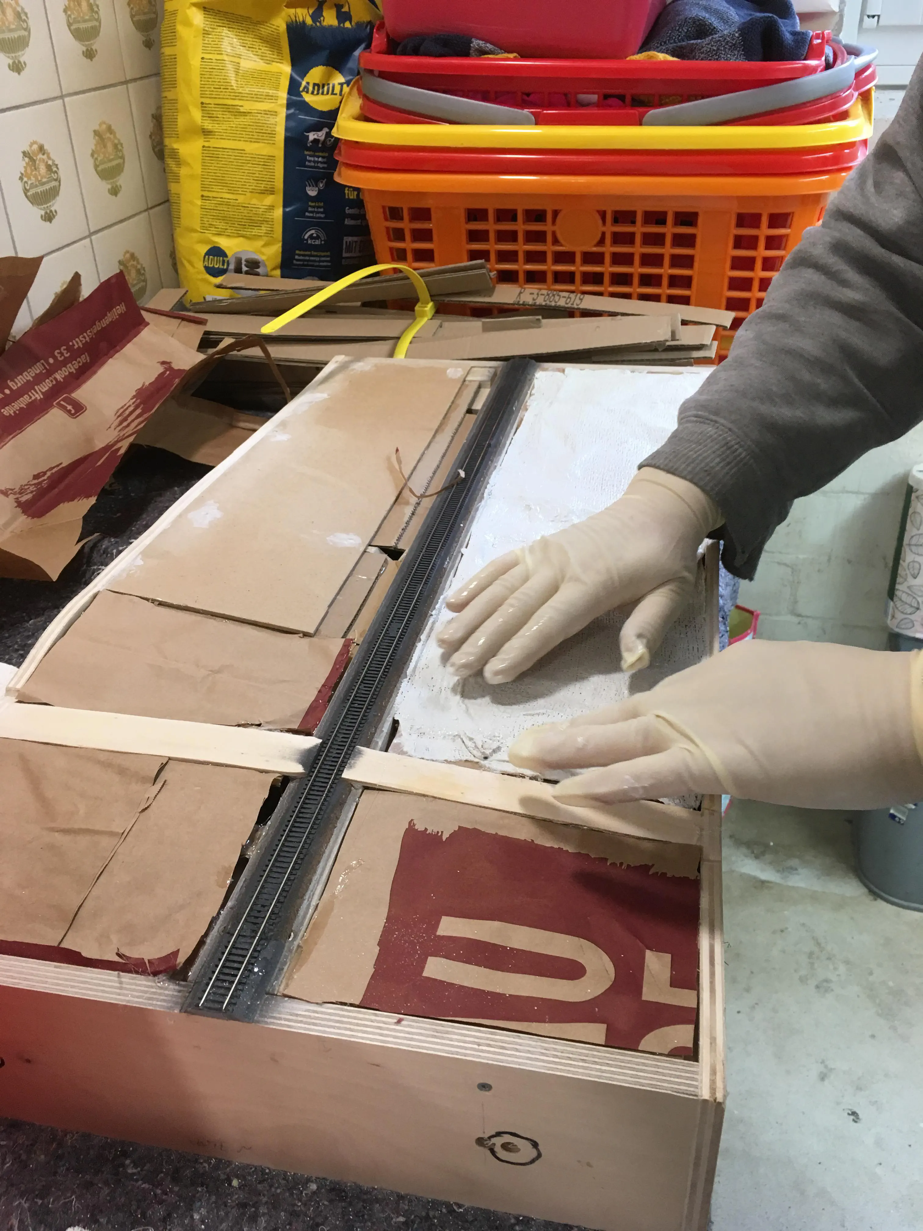 Dirk built the base for the scenery using the trusty plaster over cardboard-mesh method.Insulation-Foam and Joint-Filler