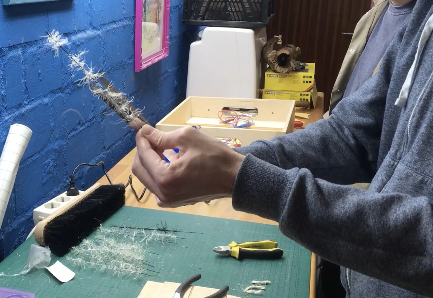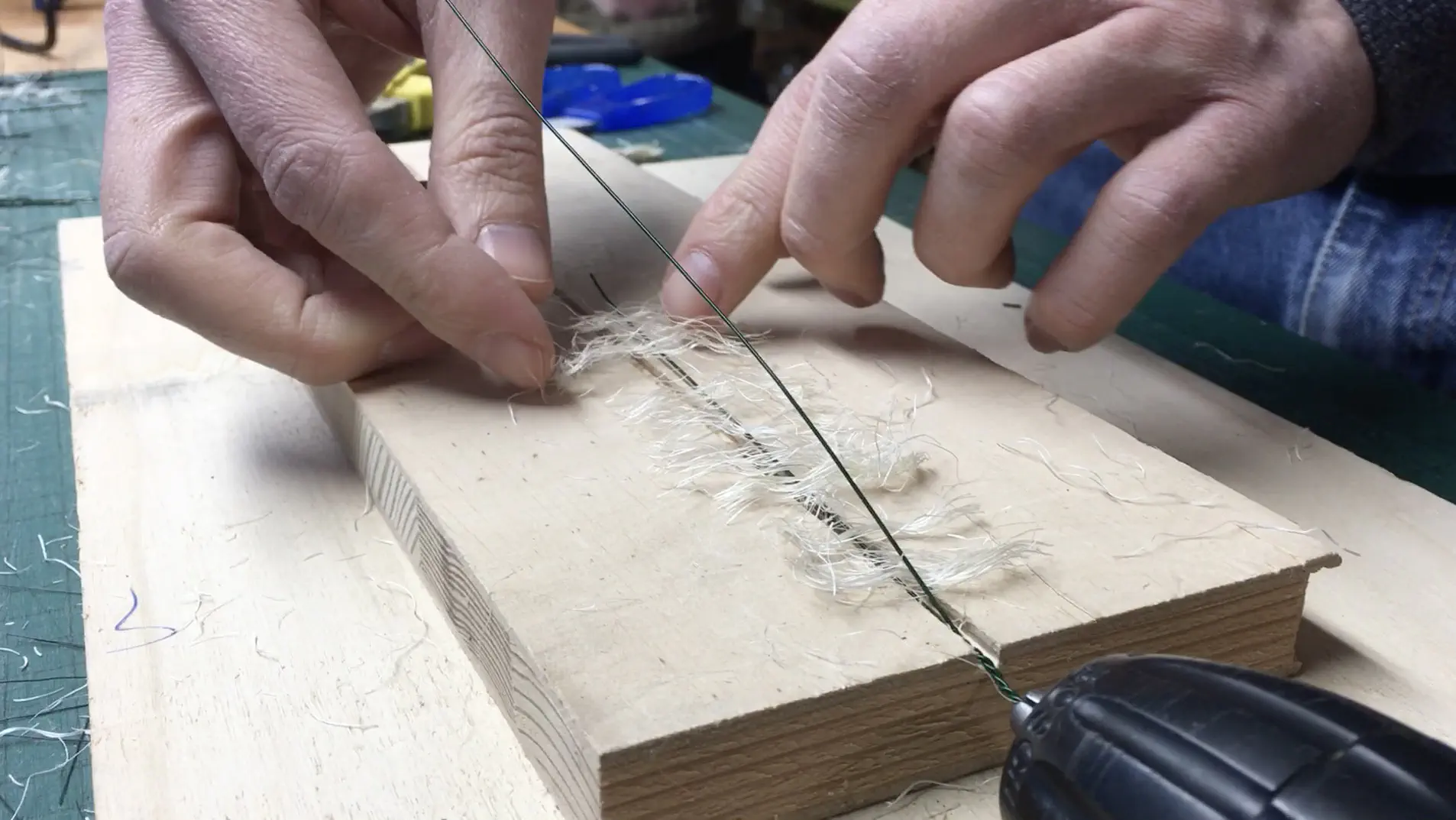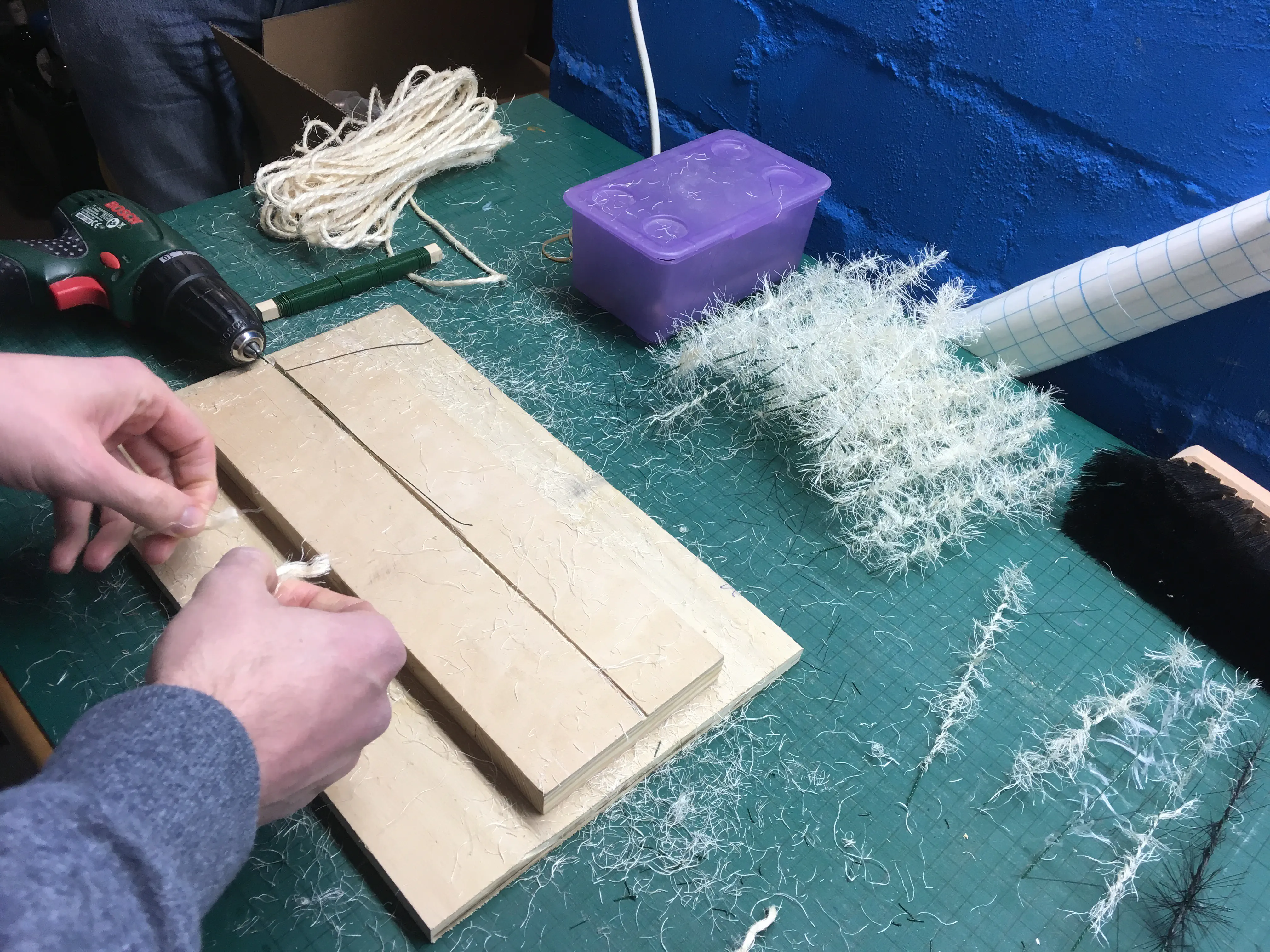 Martin built trees. I could supply him with a simple jig: A piece of plywood with a notch to position one of the two required wires. To build a twist-tree you need two pieces of wire, some fibres for the twigs. As tools and a pair of pliers and a cordless drill might come in handy.