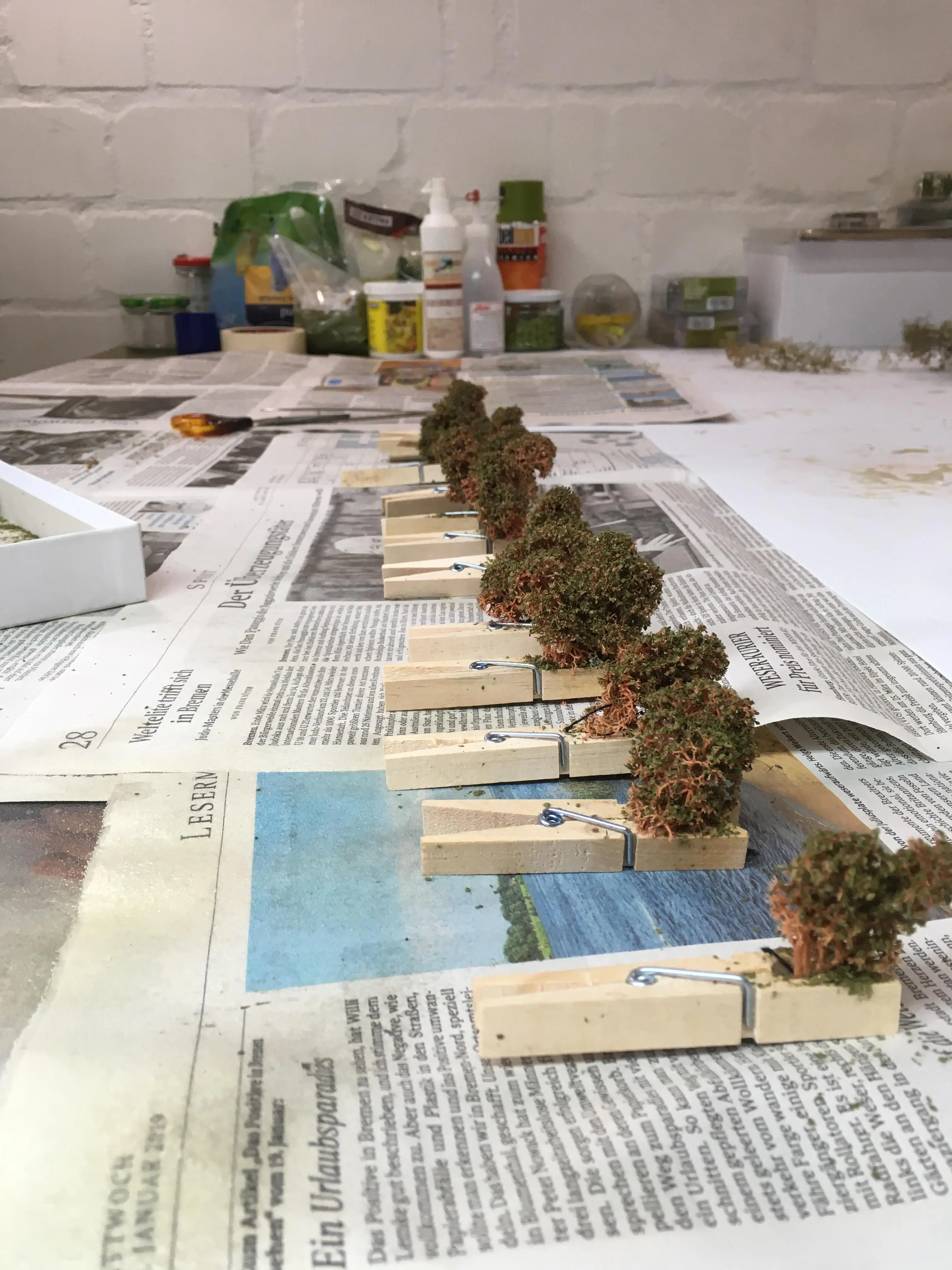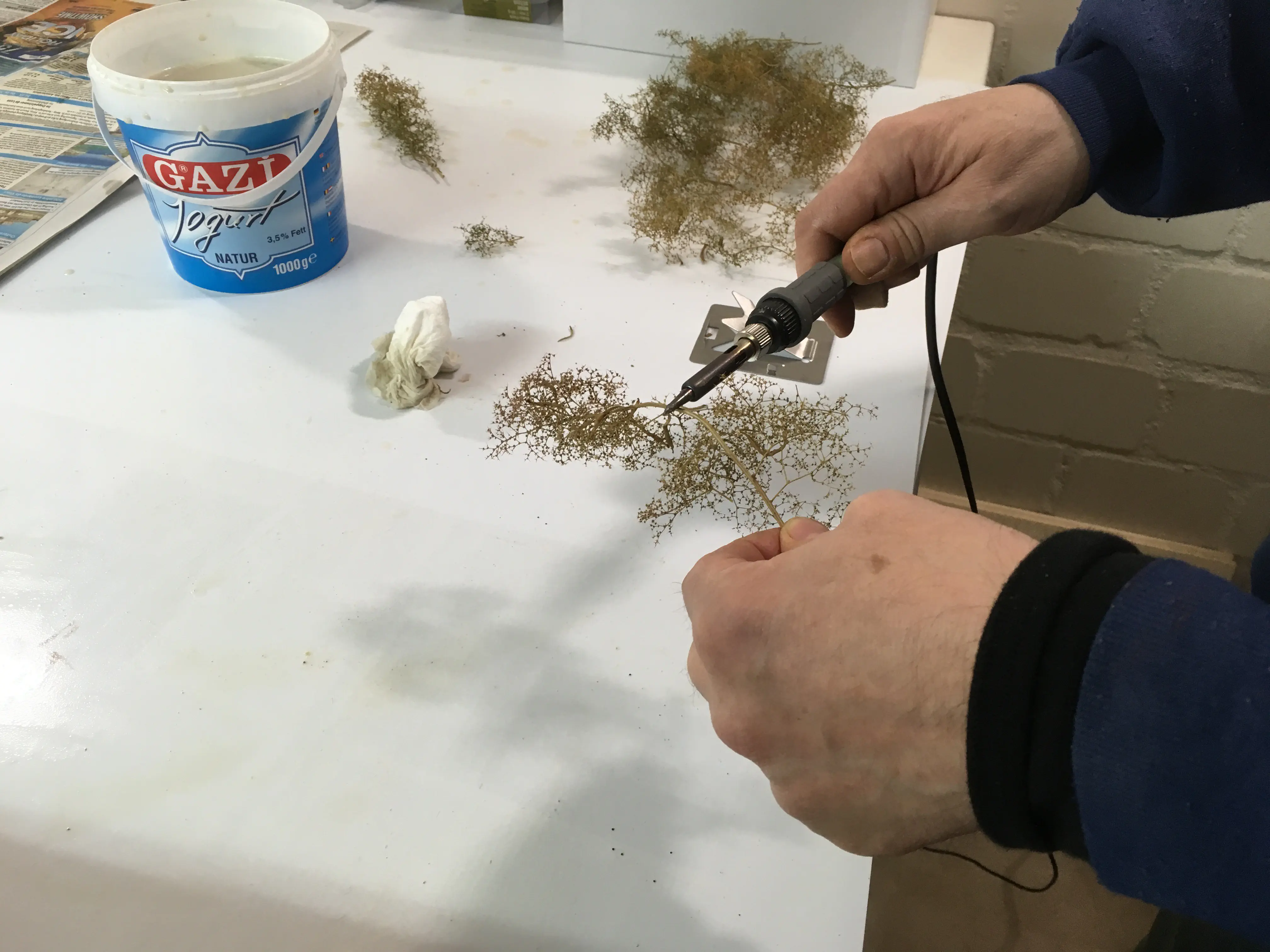 Mass production of sea-moss trees.On the first day Peter and Wolfgang started a mass production of trees and bushes for their modules. The next day these trees were dry and ready for their use.Looks like the real thing