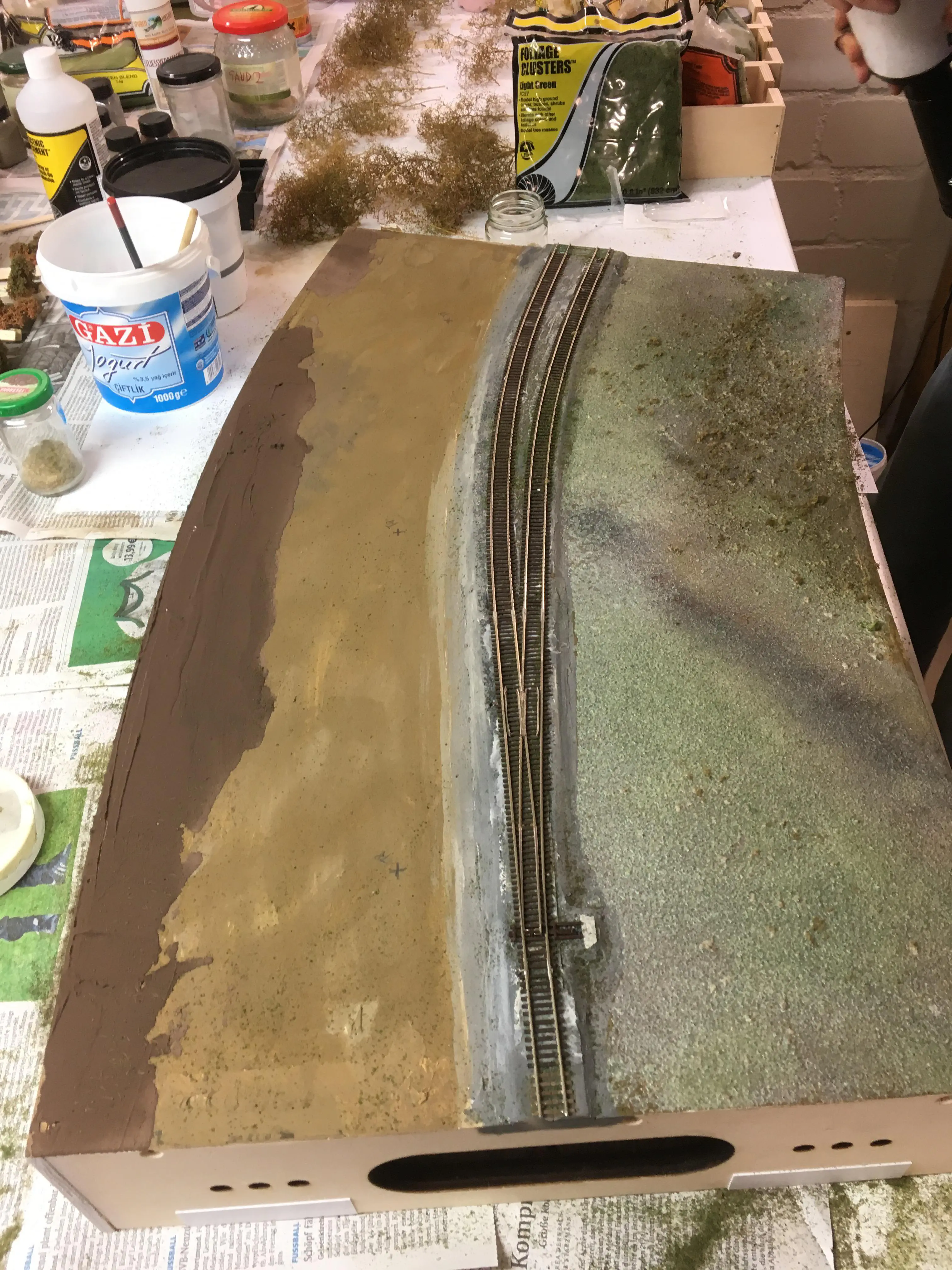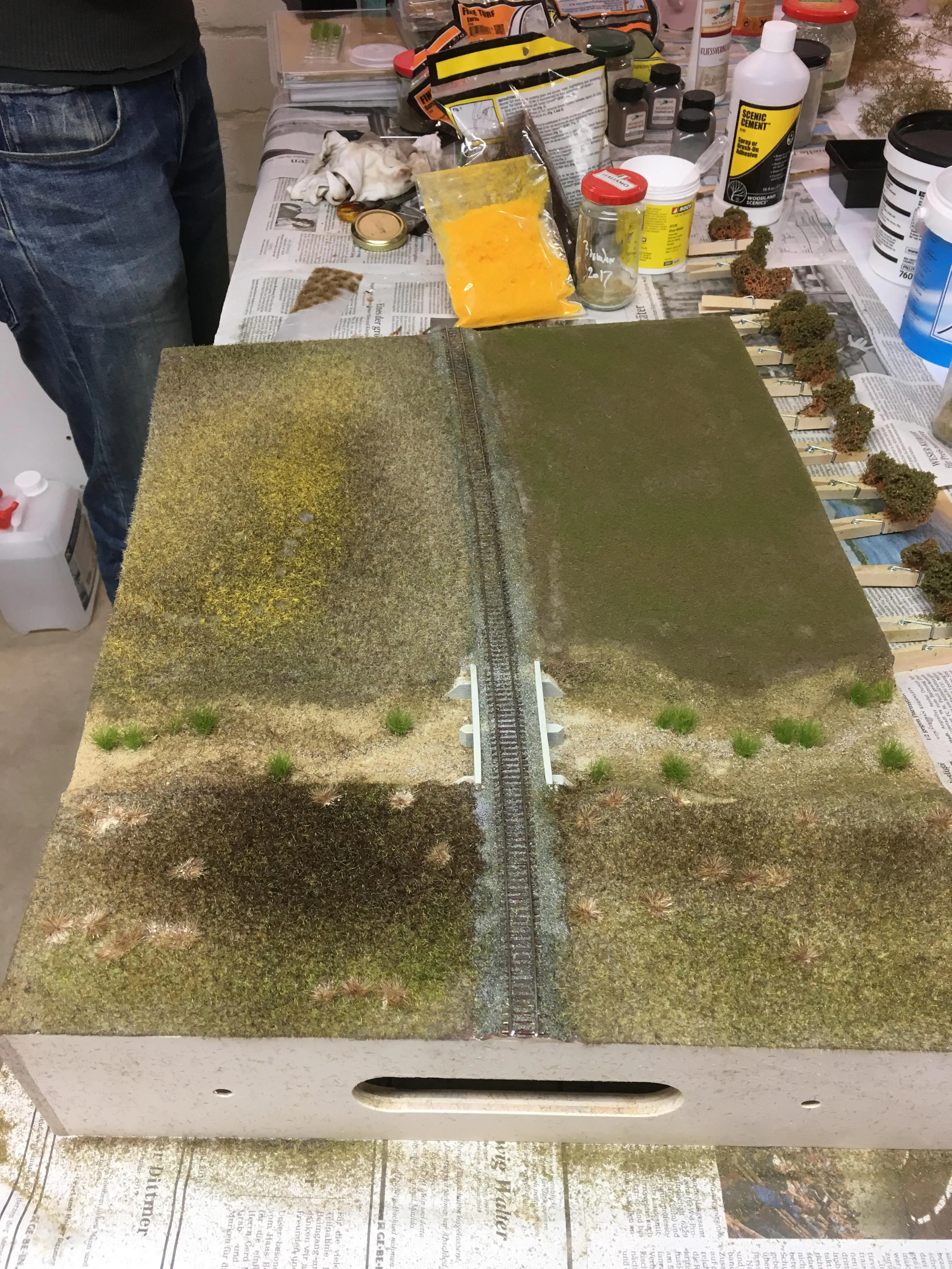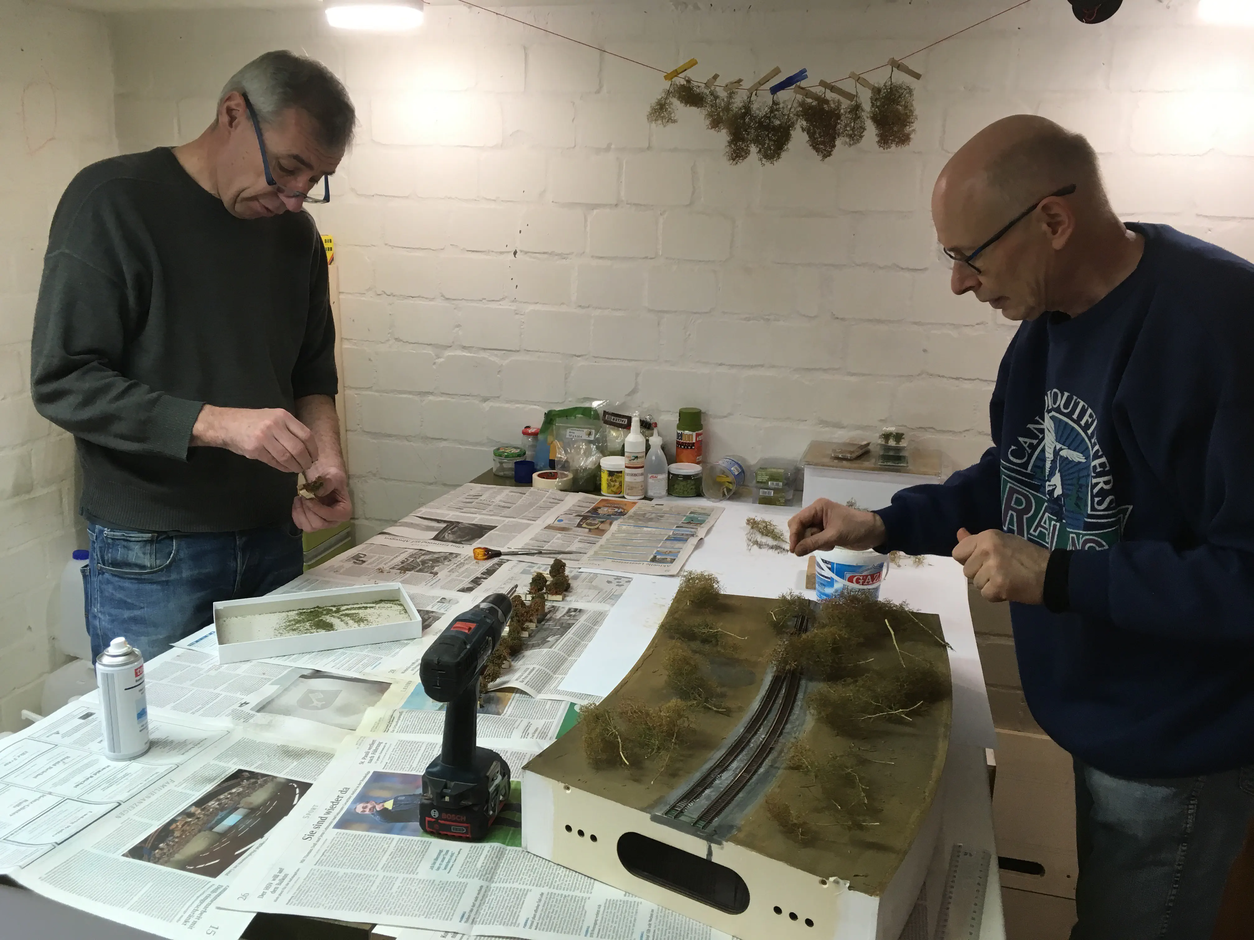 Peter and Wolfgang made some progress.Peter and Wolfgang made an astonishing progress with their modules. The trees built before came to a good use accompanied by fine and coarse turfs and some static grass in multiple colors. Peter finished his dried riverbed-scene and Wolfgang and Peter worked together on Wolfgangs double-track curves for his Arrowhead-Module.It was an enjoyable weekend, we made a good progress and had lots of fun, cake and coffee.
