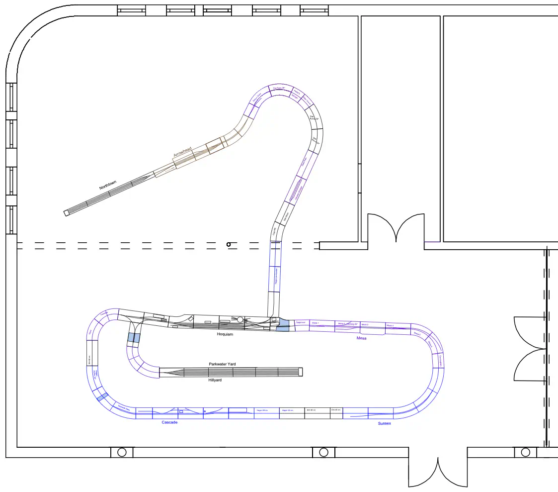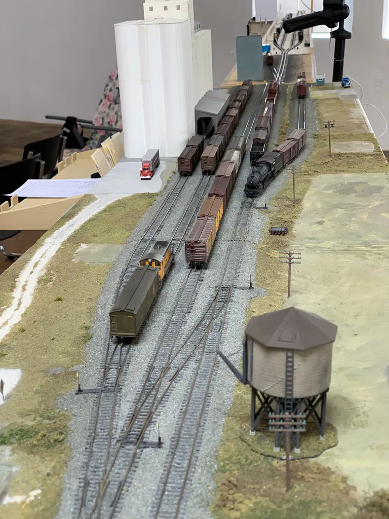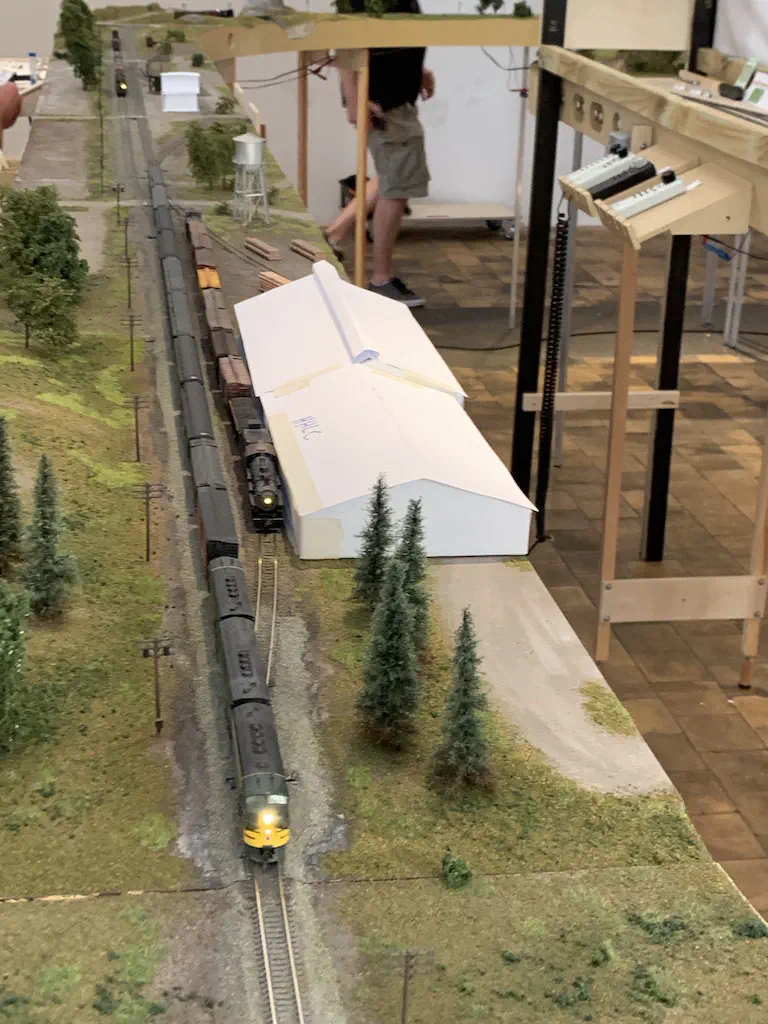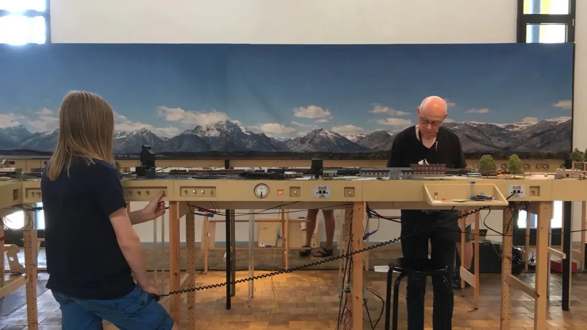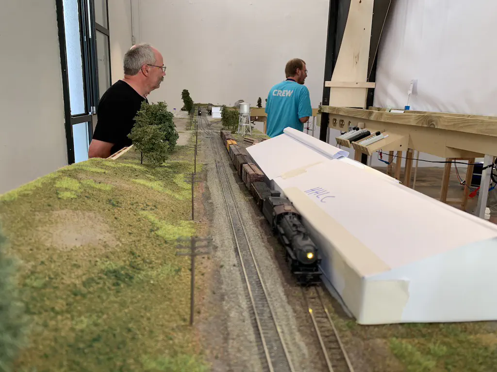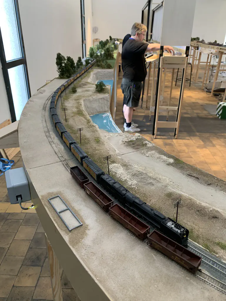 Early setup: Unload and carry everything into the room.In July we setup the exhibition layout and added a small branch to have further options for the operations. Only eight people were involved, including my kids which spent most of the time using my stream-on flat rate and watched YouTube or Netflix. But they also rand some trains and my son even had the chance to dispatch during one of the sessions. The backdrop is assembled for the first time.After spending the first day with setup and preparations, we had three days of nice, relaxed operations. The layout consists of a loop which is not used as such. We decided to partition the single fiddle yard in the center into two different locations: Parkwater Yard and Hillyard. Thus we had a point to point layout. To travel from Parkwater to Hillyard a train has to take the Wye into Hoquiam, pass Mesa, Sussex and Cascade and make a turn right through the other track of the Wye. This gave us a nice mainline run of about 30 meters.