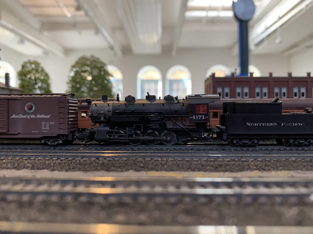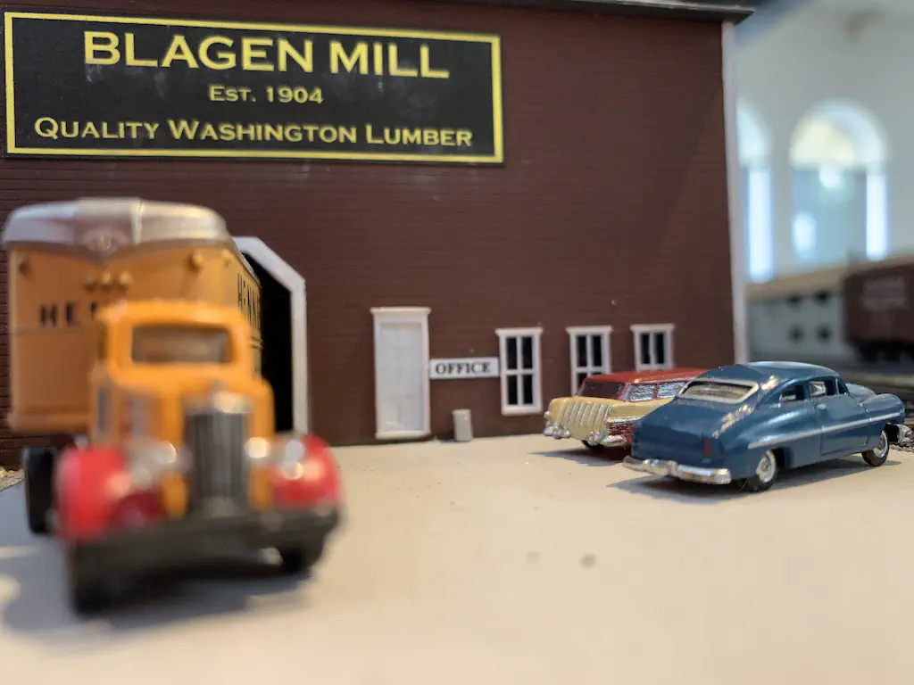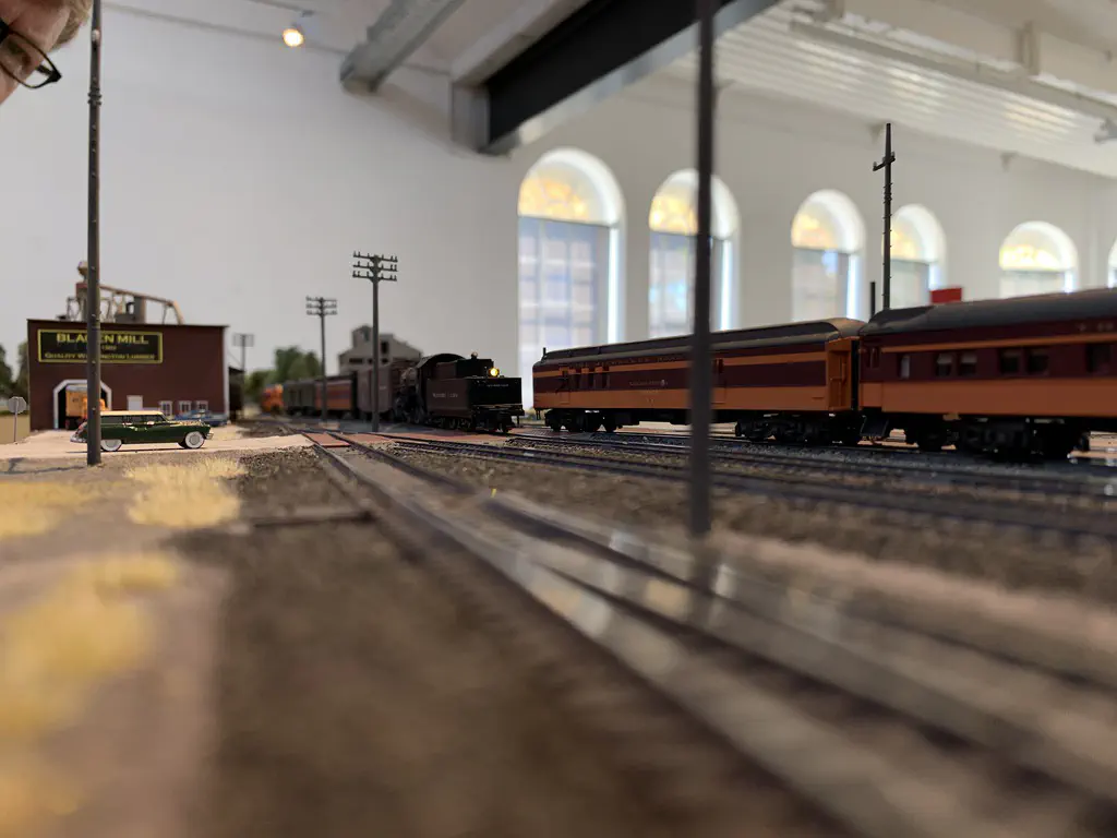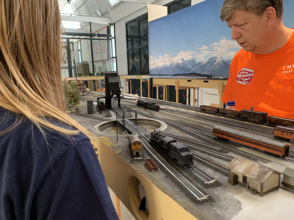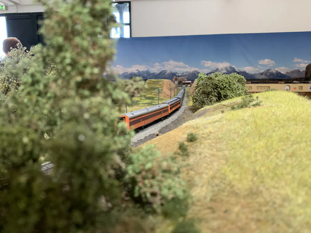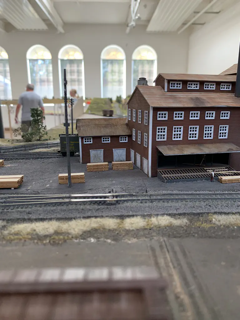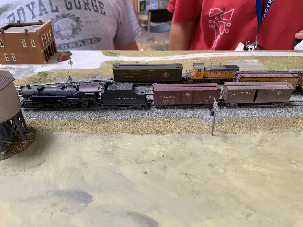 Early setup: Unload and carry everything into the room.In July we setup the exhibition layout and added a small branch to have further options for the operations. Only eight people were involved, including my kids which spent most of the time using my stream-on flat rate and watched YouTube or Netflix. But they also rand some trains and my son even had the chance to dispatch during one of the sessions. The backdrop is assembled for the first time.After spending the first day with setup and preparations, we had three days of nice, relaxed operations. The layout consists of a loop which is not used as such. We decided to partition the single fiddle yard in the center into two different locations: Parkwater Yard and Hillyard. Thus we had a point to point layout. To travel from Parkwater to Hillyard a train has to take the Wye into Hoquiam, pass Mesa, Sussex and Cascade and make a turn right through the other track of the Wye. This gave us a nice mainline run of about 30 meters.
