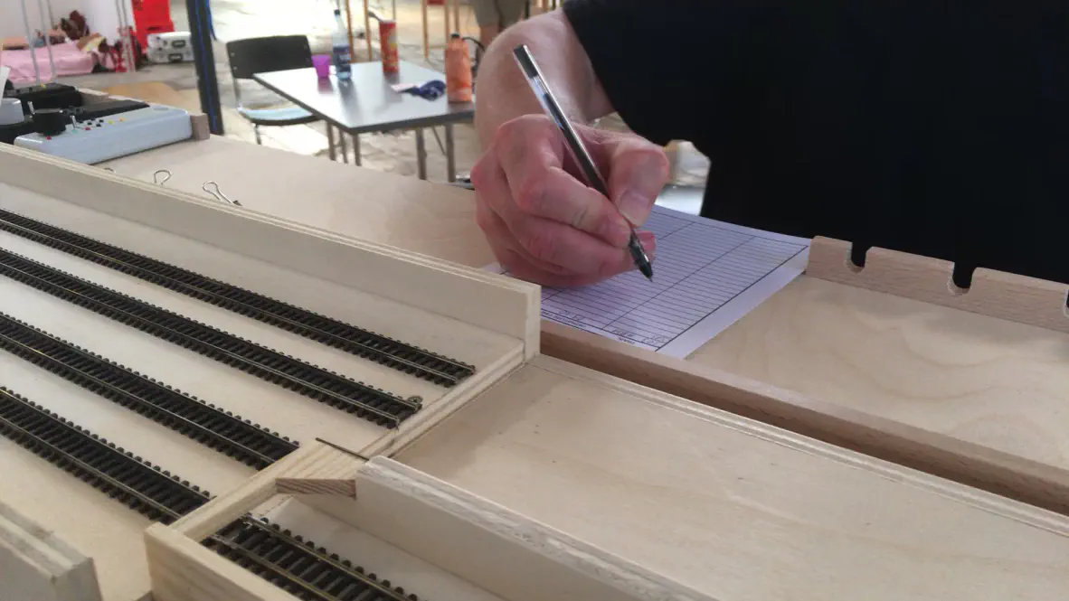 Operations took place under Time Table and Train Order (TT&TO). A dispatcher had the job of organizing the traffic for all non scheduled trains (extras). Heiko brought his new wireless clocks, which receive the JRMI clock signal. The dispatcher can speed up the clock if he gets bored. Usually we run the clock at normal speed and just create a timetable with times that match the size of the layout. Heiko also brought some wireless controllers (wiFRED) for testing. We hope that we can use them at the exhibition in Rodgau and do not need to plug- and unplug our controllers all the day. (Spoiler: We did and they worked perfectly and we used them all the time).