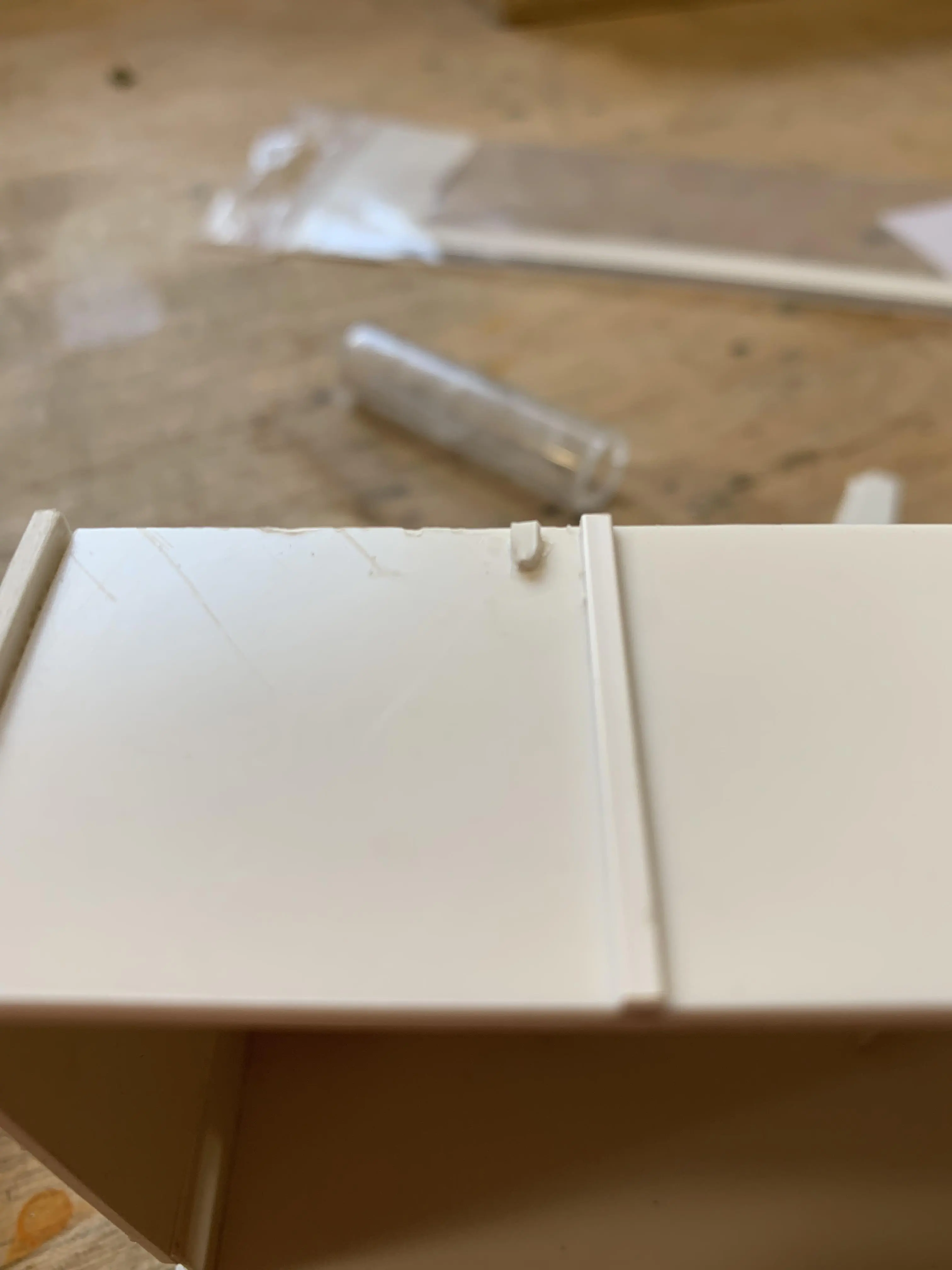 Rainwater pipe installed.I carved the connections for the rainwater pipe out of some left over bits of styrene. I choose 0,5 mm² wire as a pipe. Thats slightly too thin, but the closest I could get with the available material. To attache the “pipe” a 0.5 mm hole was drilled into the spout. The insulation was left on the wire at the very bottom to show the connection to the underground sewer.