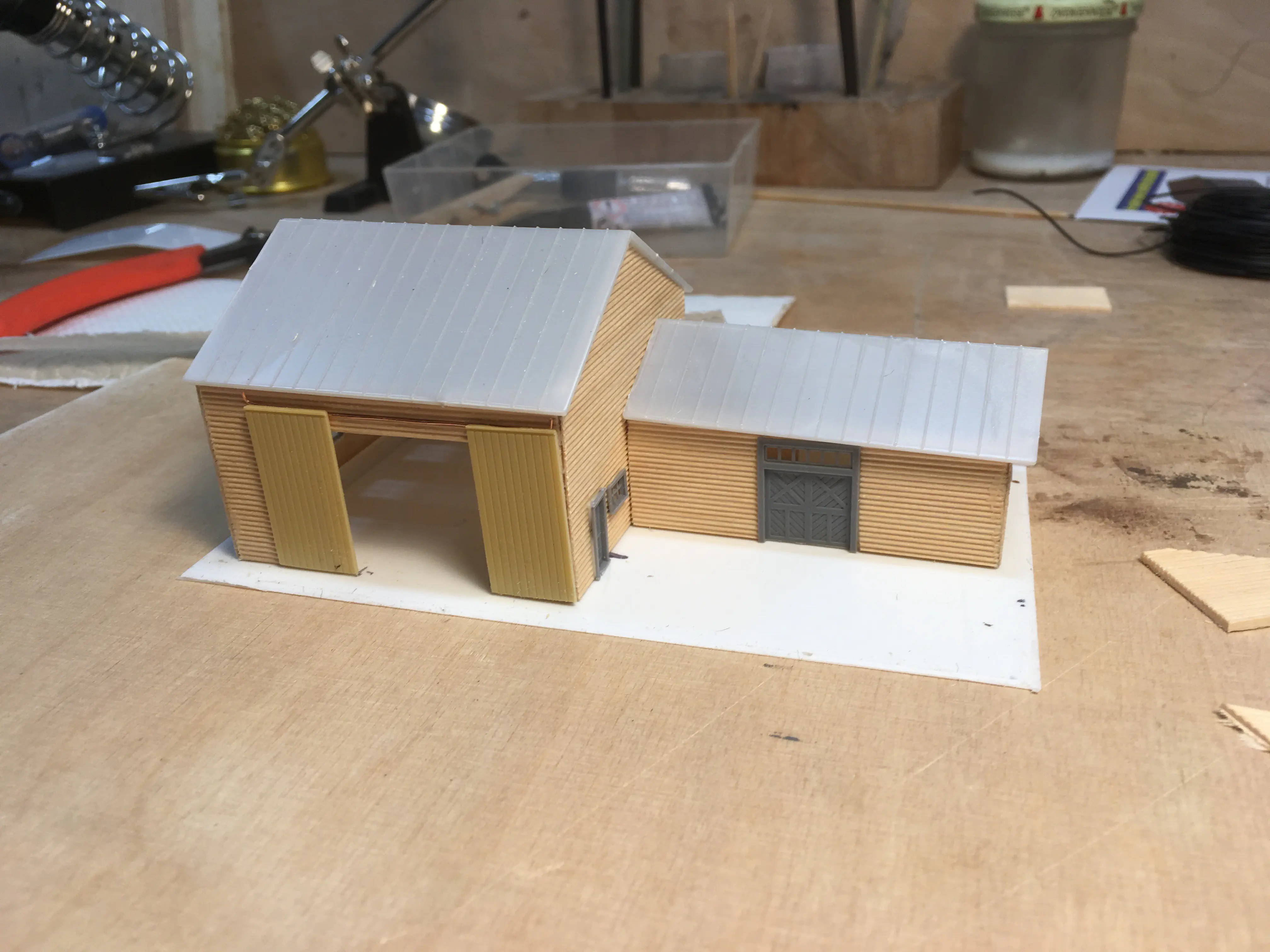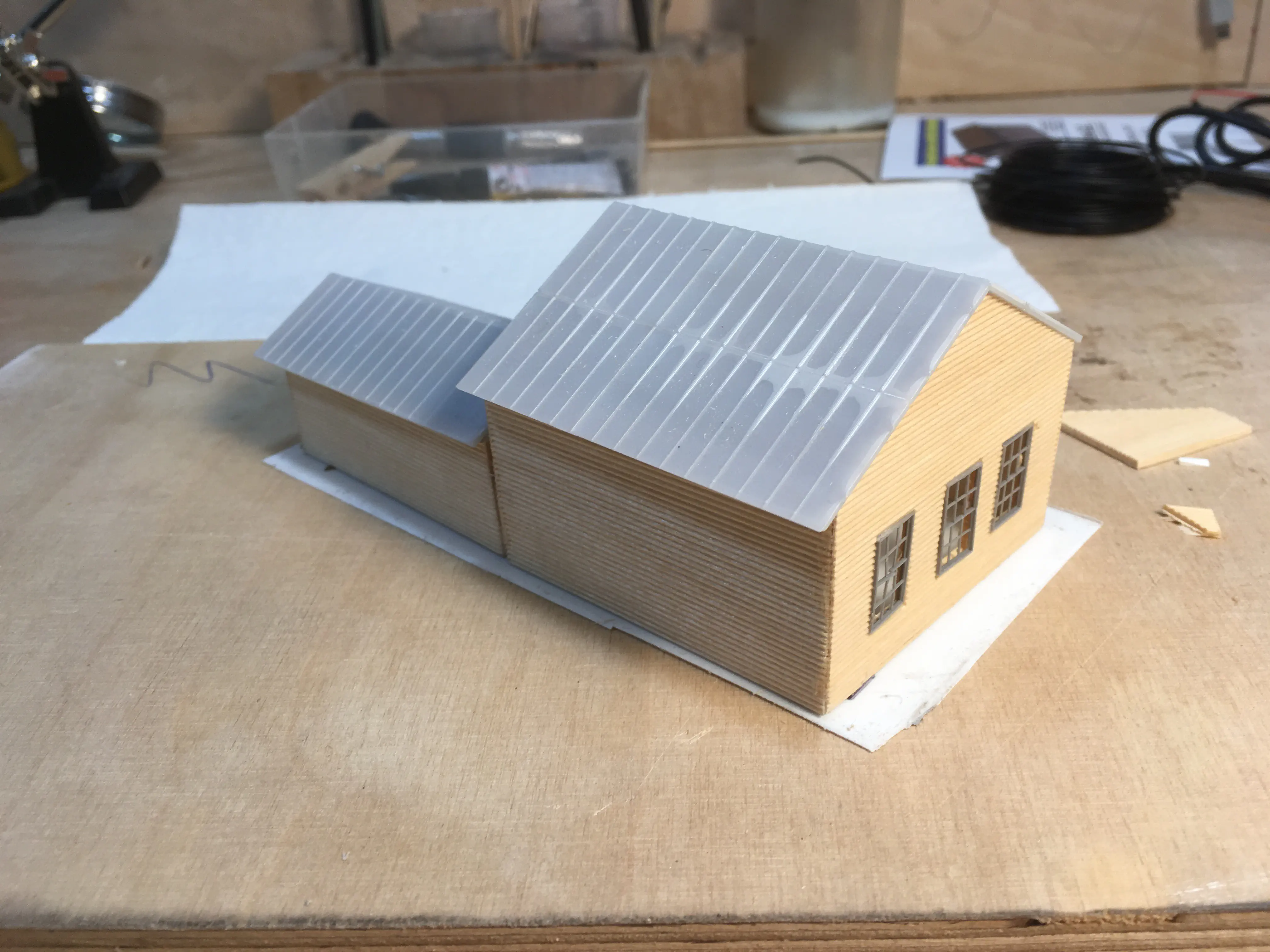 The workshop is completely scratch built and freelanced. I just created a structure to use the left over plastic parts for a roof and some windows and doors I had lying around. The walls are sheets of scale lumber based on a thin sheet of styrene. I painted it in a red-brown color. After painting I gave it a shot of dullcote to seal the paint on the wooden parts. This dullcote was not as dull as I had thought and made the wooden walls look like a plastic kit. Interesting. I weathered the structure with a mix of dark oil paints and thinner. I will add lights and details later. For this purpose the roof is held in place by a small amount of flexible adhesive and should be easily removable.See more progress in the Building Cascade Series.