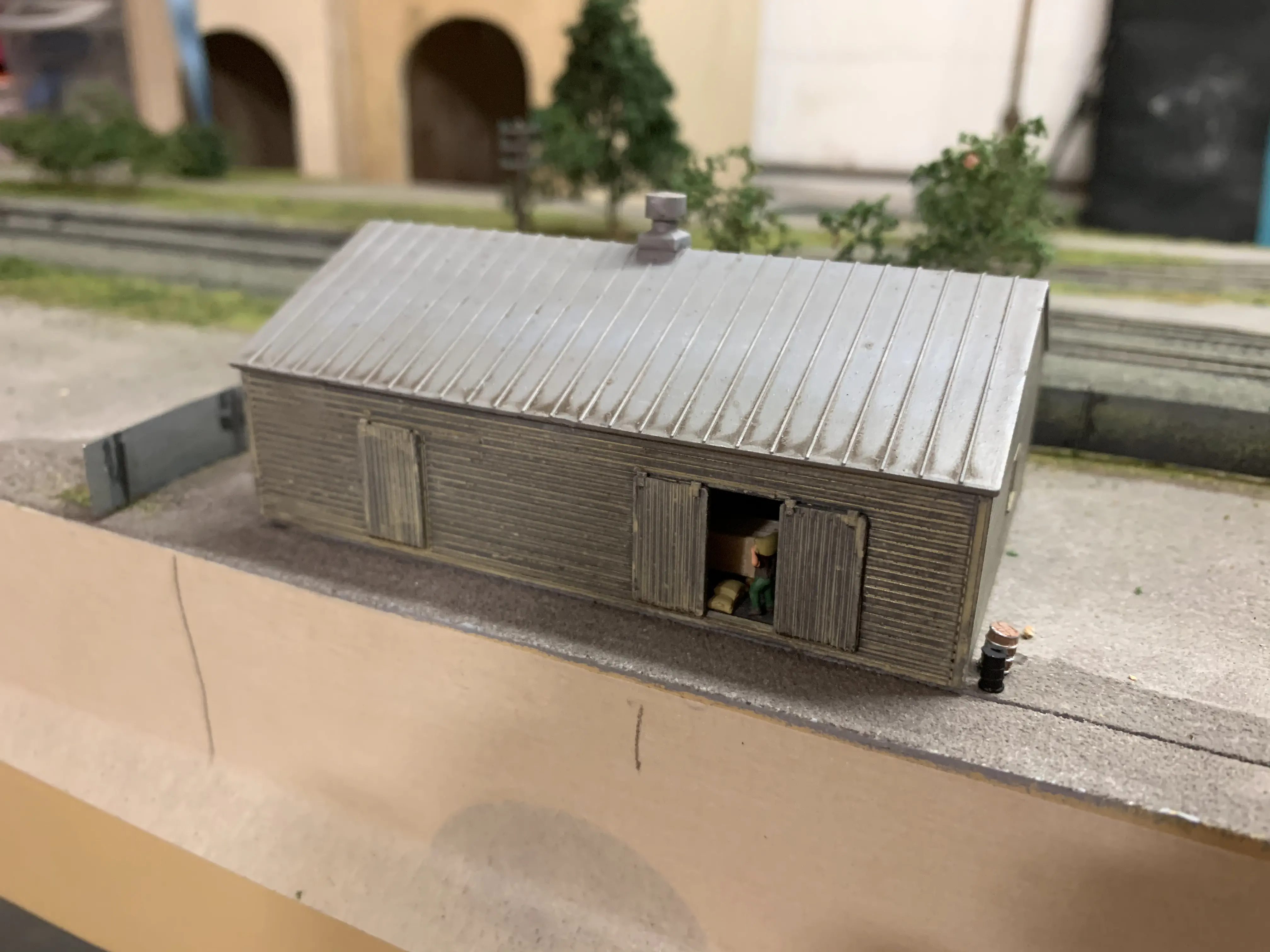I used Revell plastic putty to fill the unused door. I’m not too happy with the result but it works. After priming I sprayed it with a dark grey color. Too dark. So I had to lighten it up slightly. I added a beige wash to create the look of old paint. In the last step I weathered it with a dirt wash made of burned umber and black oil paints with thinner. After gluing it in place I added some life with boxes and the only figure I have used so far.