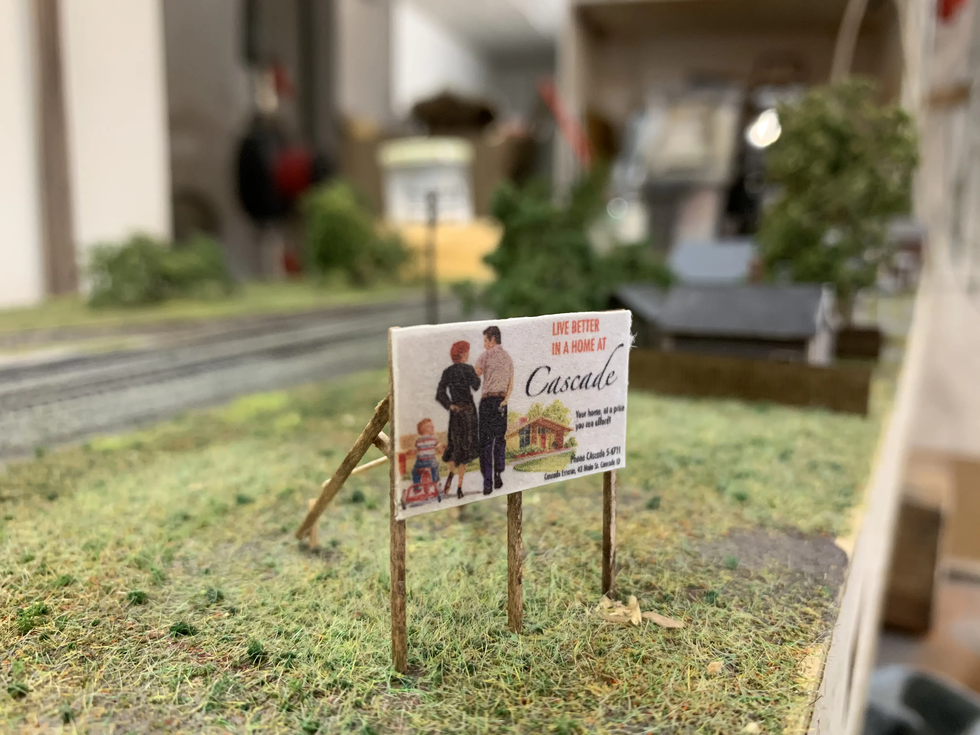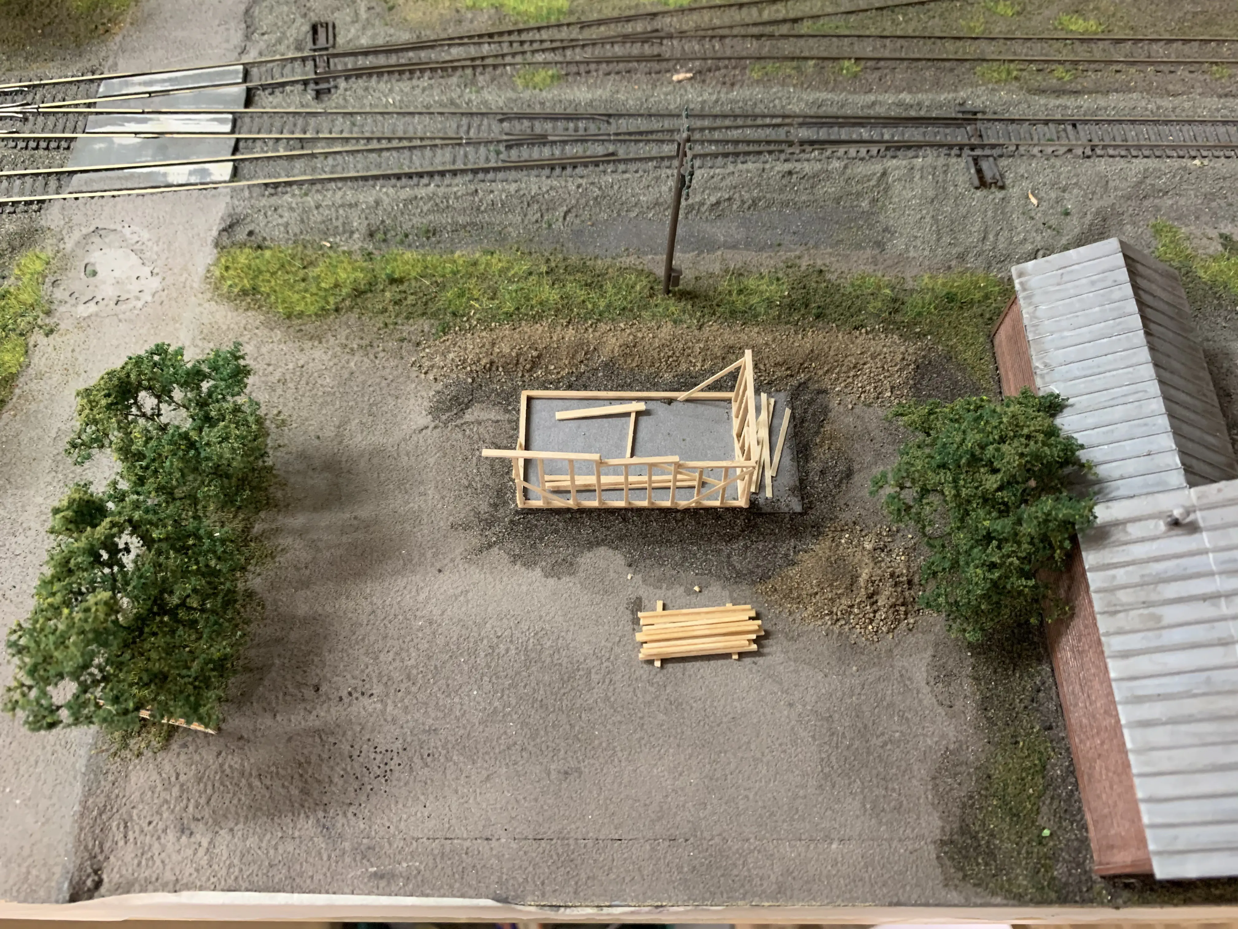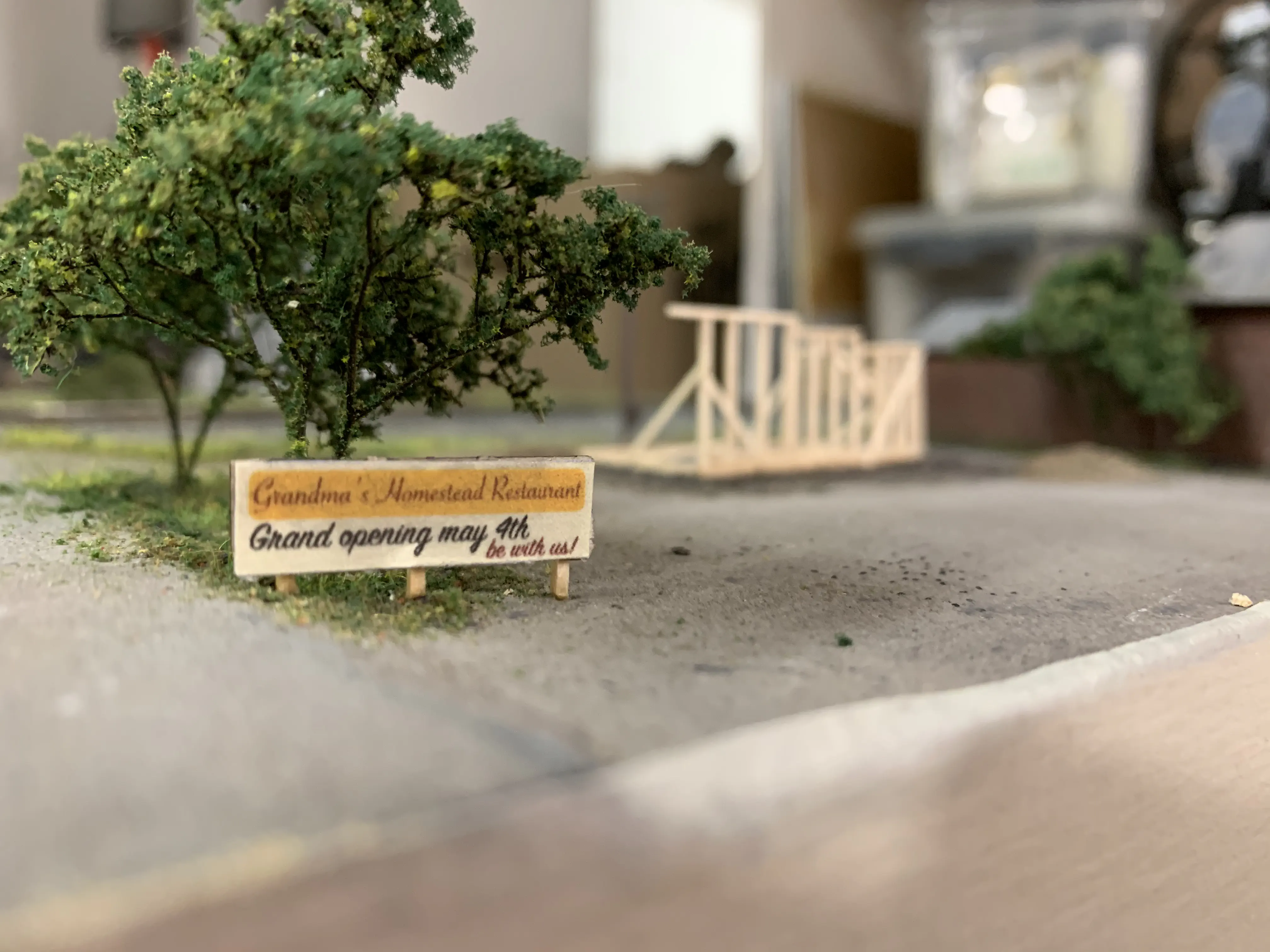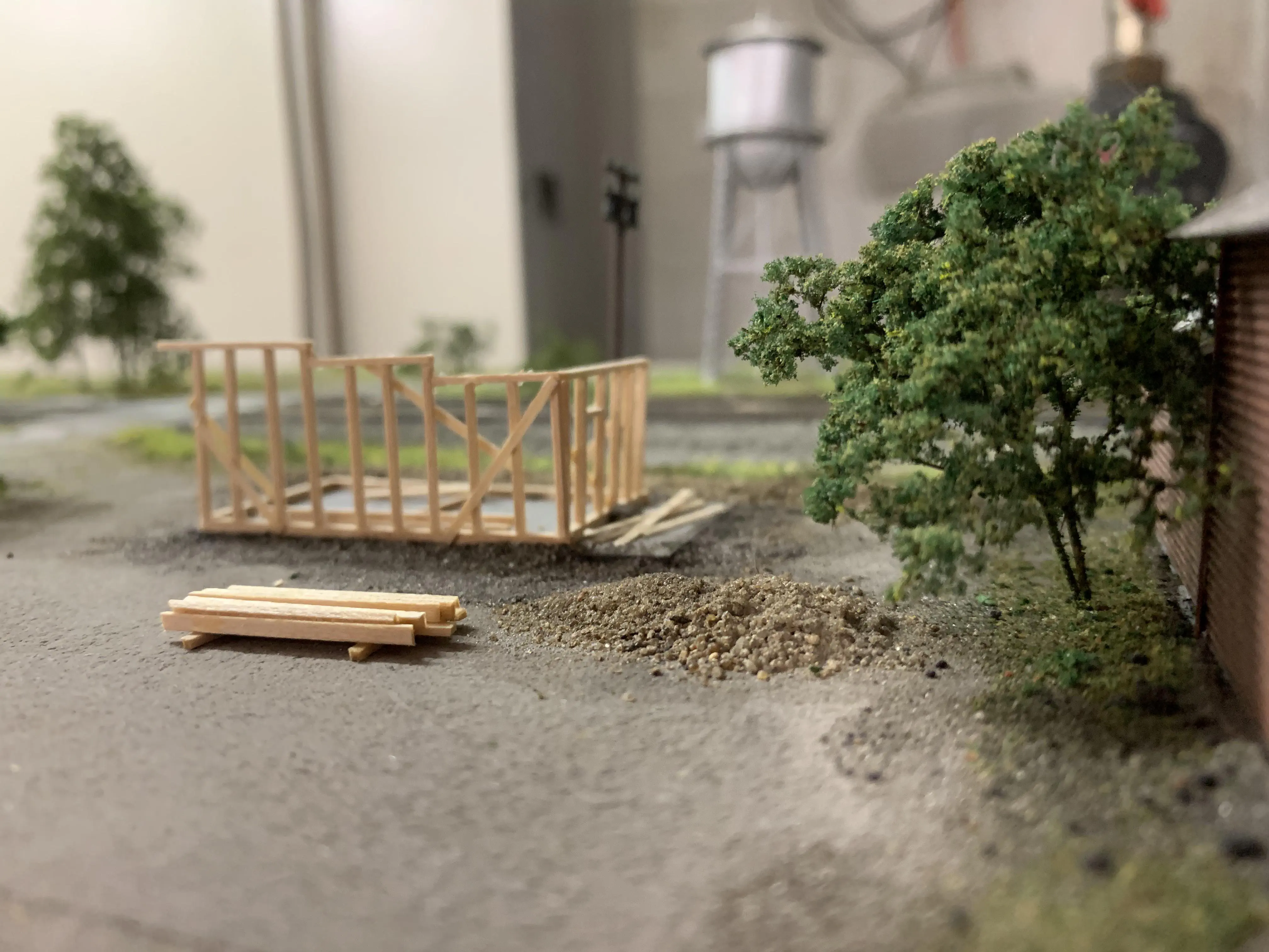 Wanting to add a diner to the module but without enough time to build one, I decided to add a construction site and show the diner being built. I built a foundation using card board. Then I added studs and some frames made of scale lumber. Then I added a sign informing the viewers about what’s to happen here 🙂
