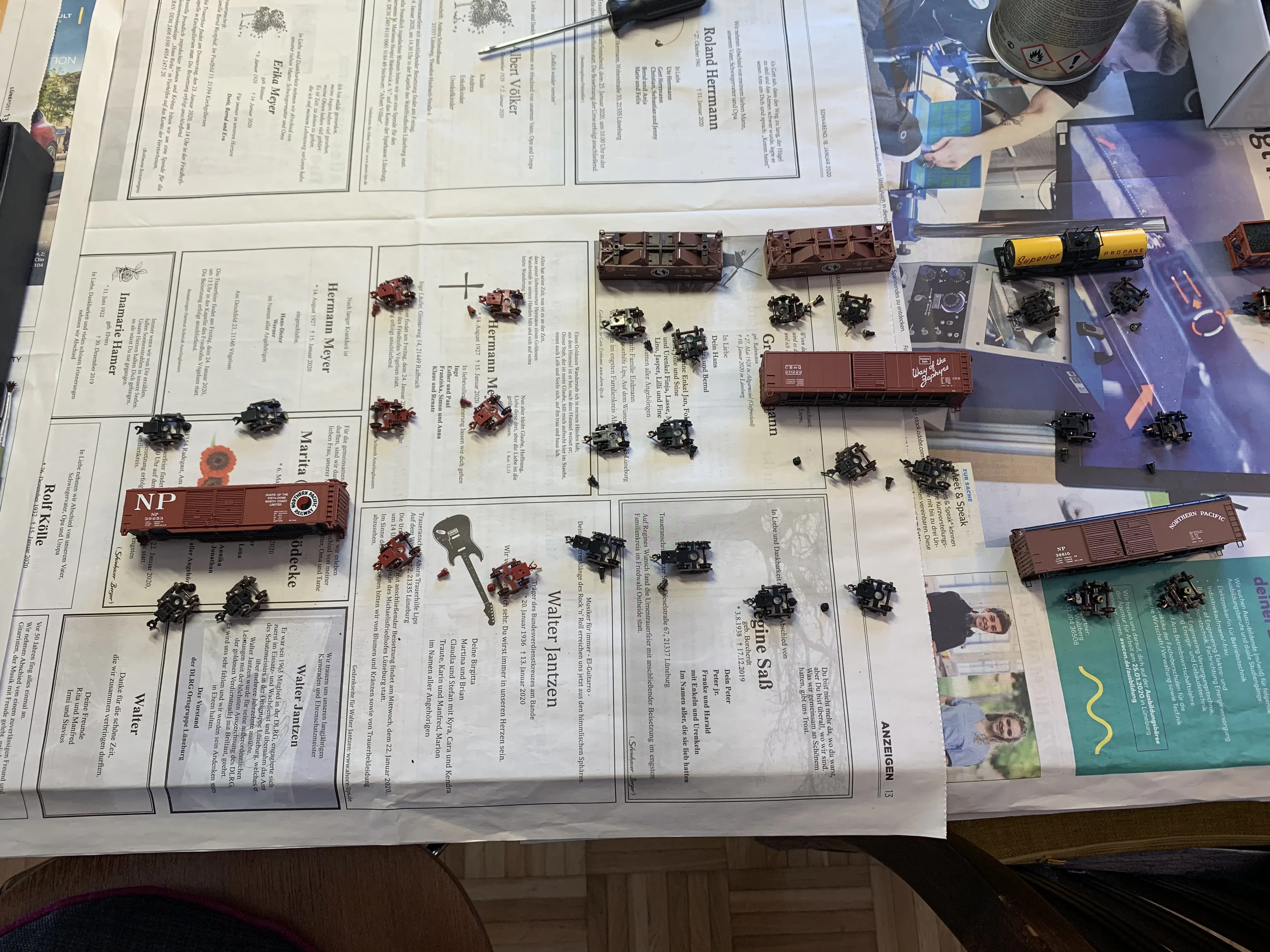 A relaxed working atmosphere with lots of chatting and relaxed work.I replaced the motors in my Atlas EMD SD-24 because they didn’t work that well. After that I applied a my usual dirt-wash to about 60 cars that had been prepared with a good shot of matte varnish.