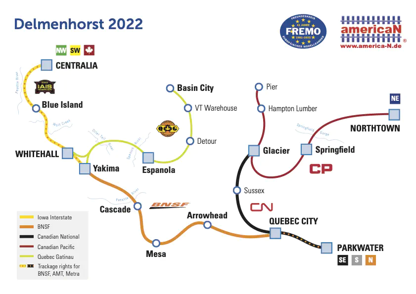 The routes should be operated by different railroad companies. The Iowa Interstate Railroad (IAIS) operated the route from Centralia (staging yard) to the Yard in Whitehall. The route between Whitehall, via Yakima, Cascade and Mesa to Quebec City was operated by BNSF. BNSF had tracking rights from Quebec City to the Parkwater Staging yard.