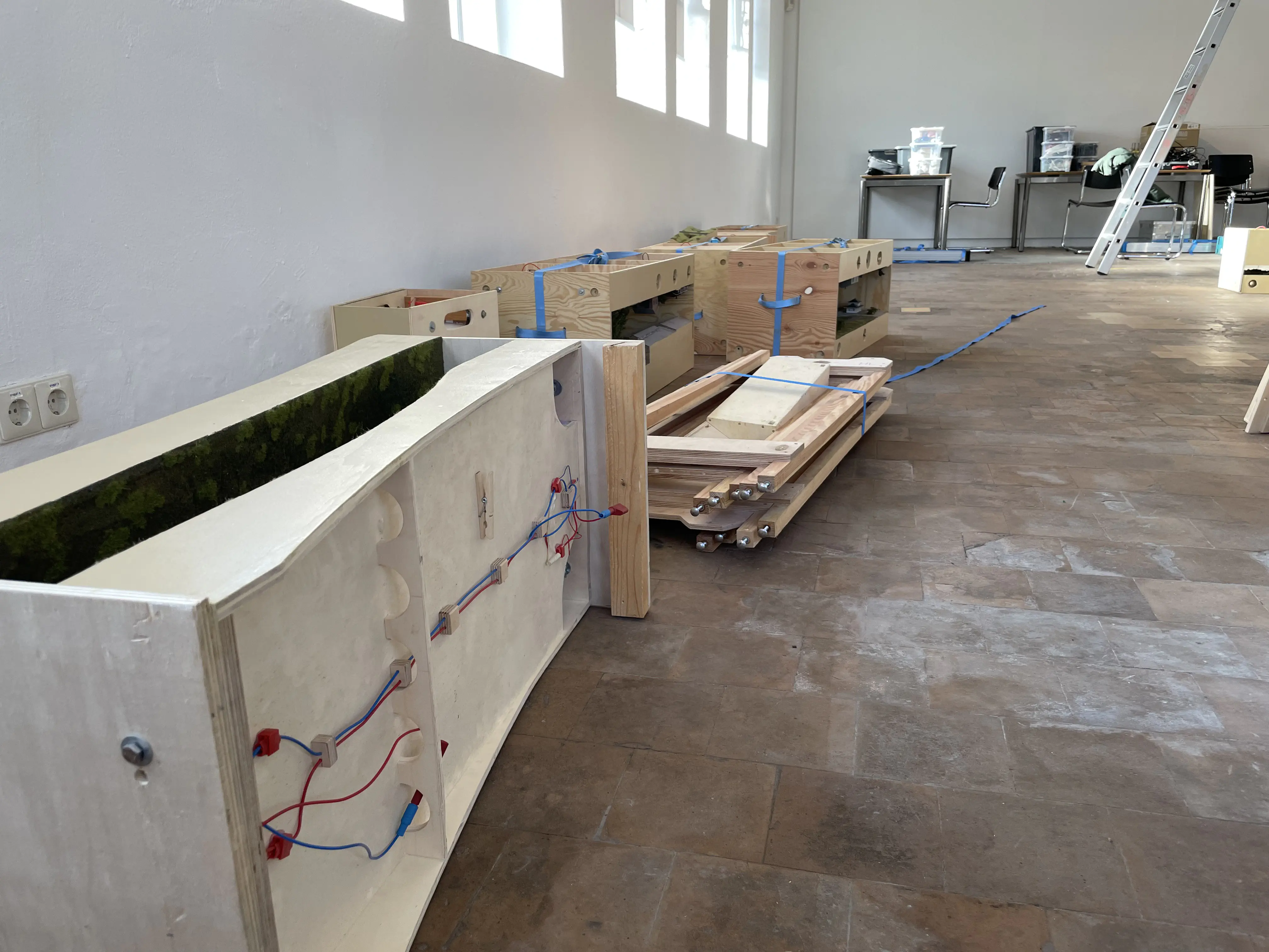 Unpacking all modules, setting up the layout and installing the loconet wiring for the boosters took about seven hours. As we intended to control the trains wireless, we did not need to install loconet boxes on the modules, only a few long cables were required to connect the seven boosters we used.