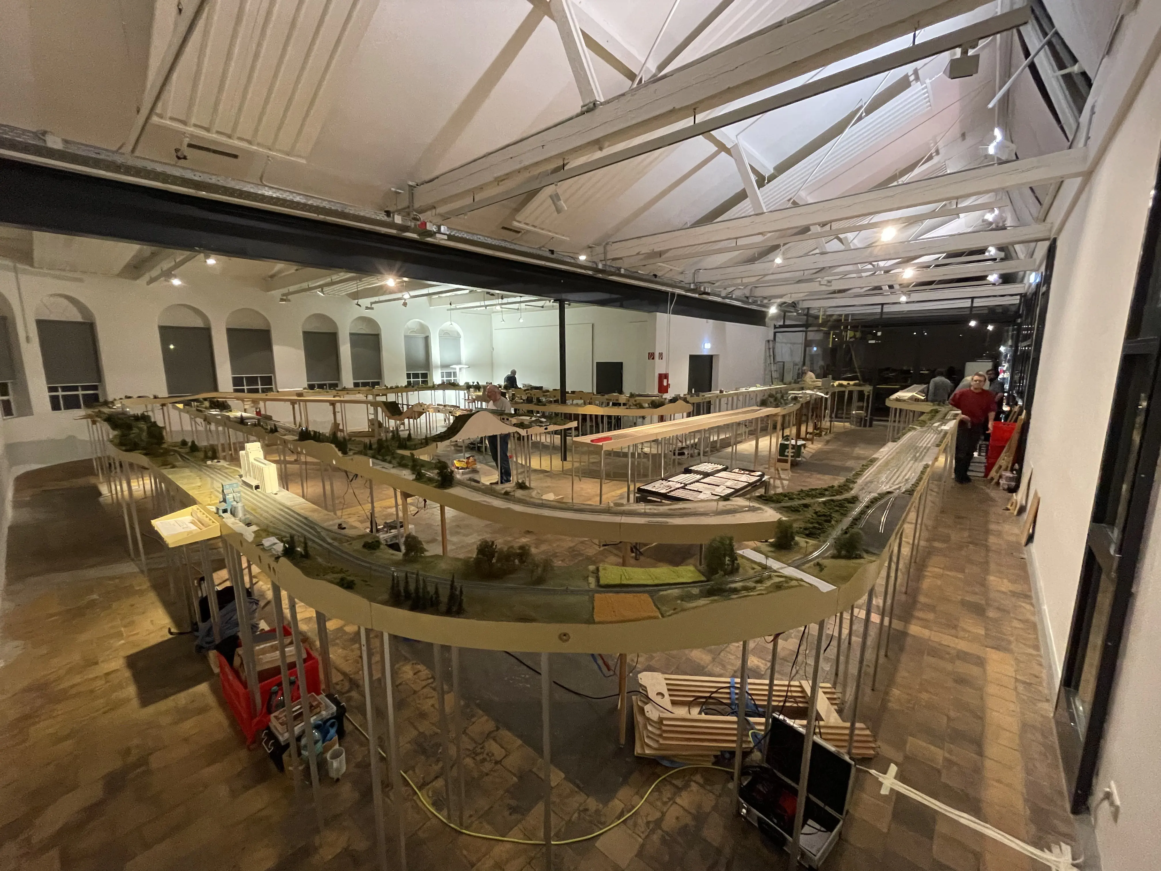The Layout consists of a 65 m Mainline between two staging yards and was extended by two branchlines of 12 and 20 meters each. So in total we setup about 100 m total length in modules, not including the three staging yards.
