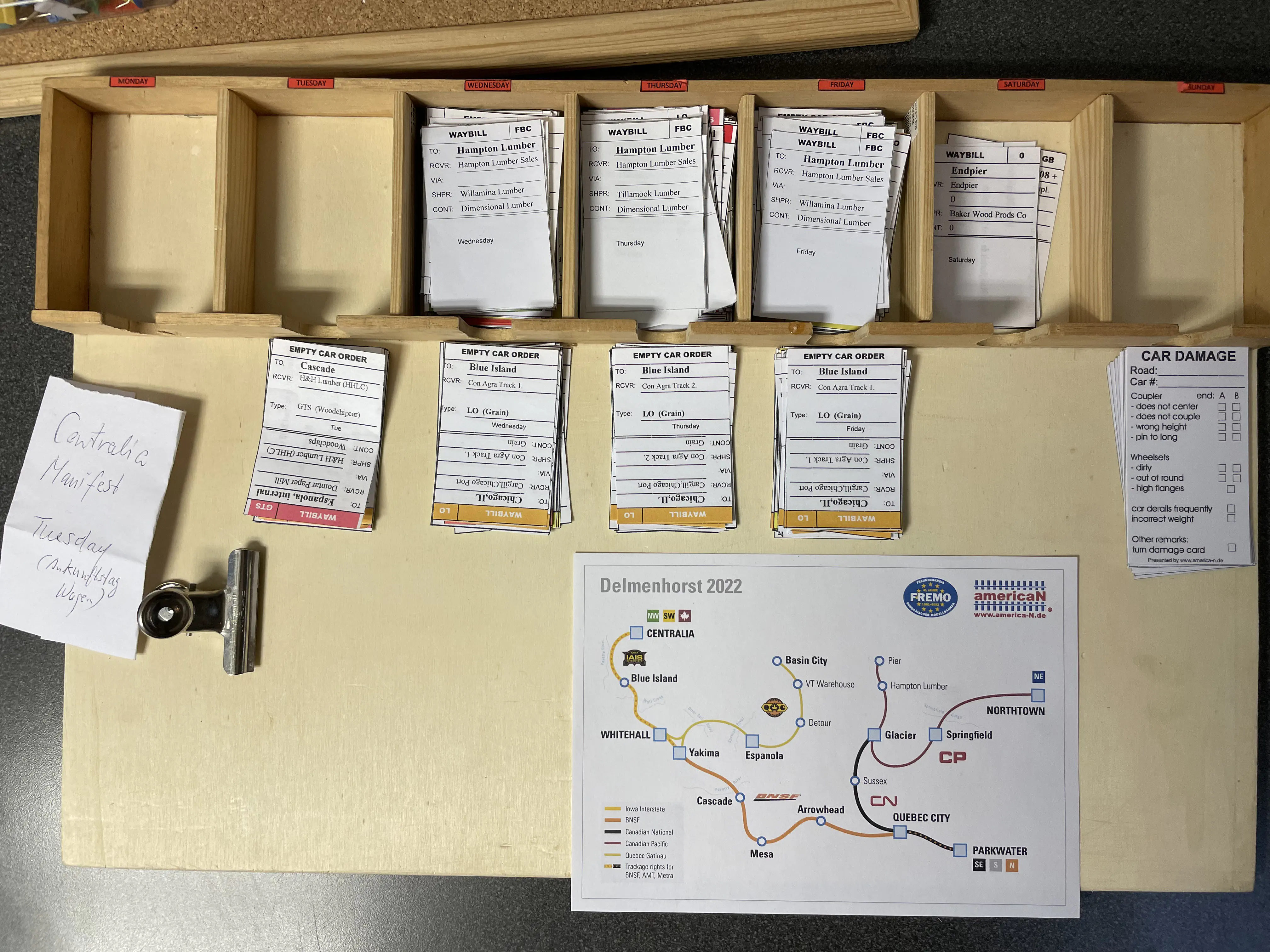 While playing the tuesdey-session, we had already staged the cars for wednesday. So the manifest delivers cars for the next session to the yards. The yardmasters sent all outbound cars with the manifest, that were received during the last session. They could then start to setup the locals for the next session.