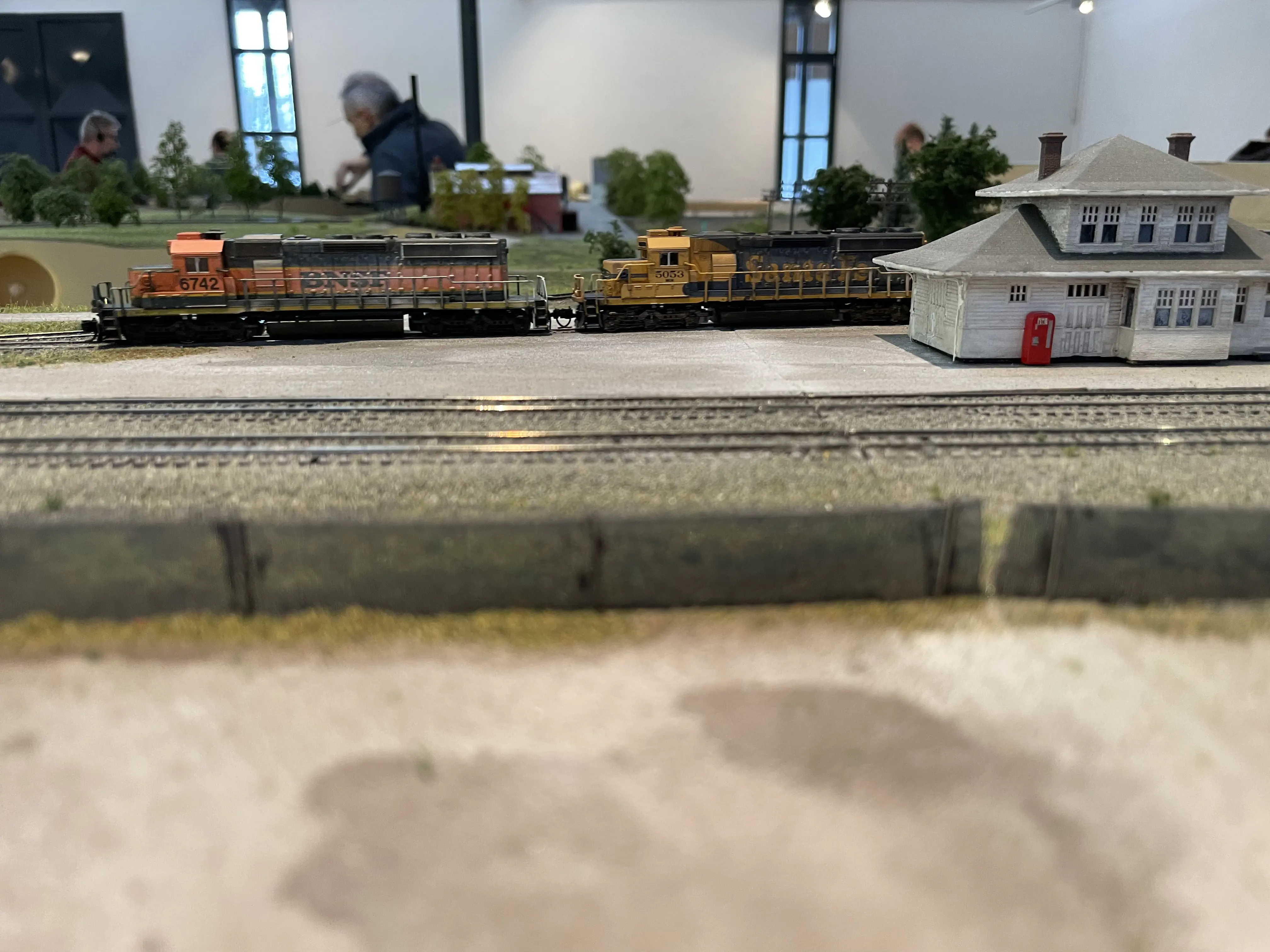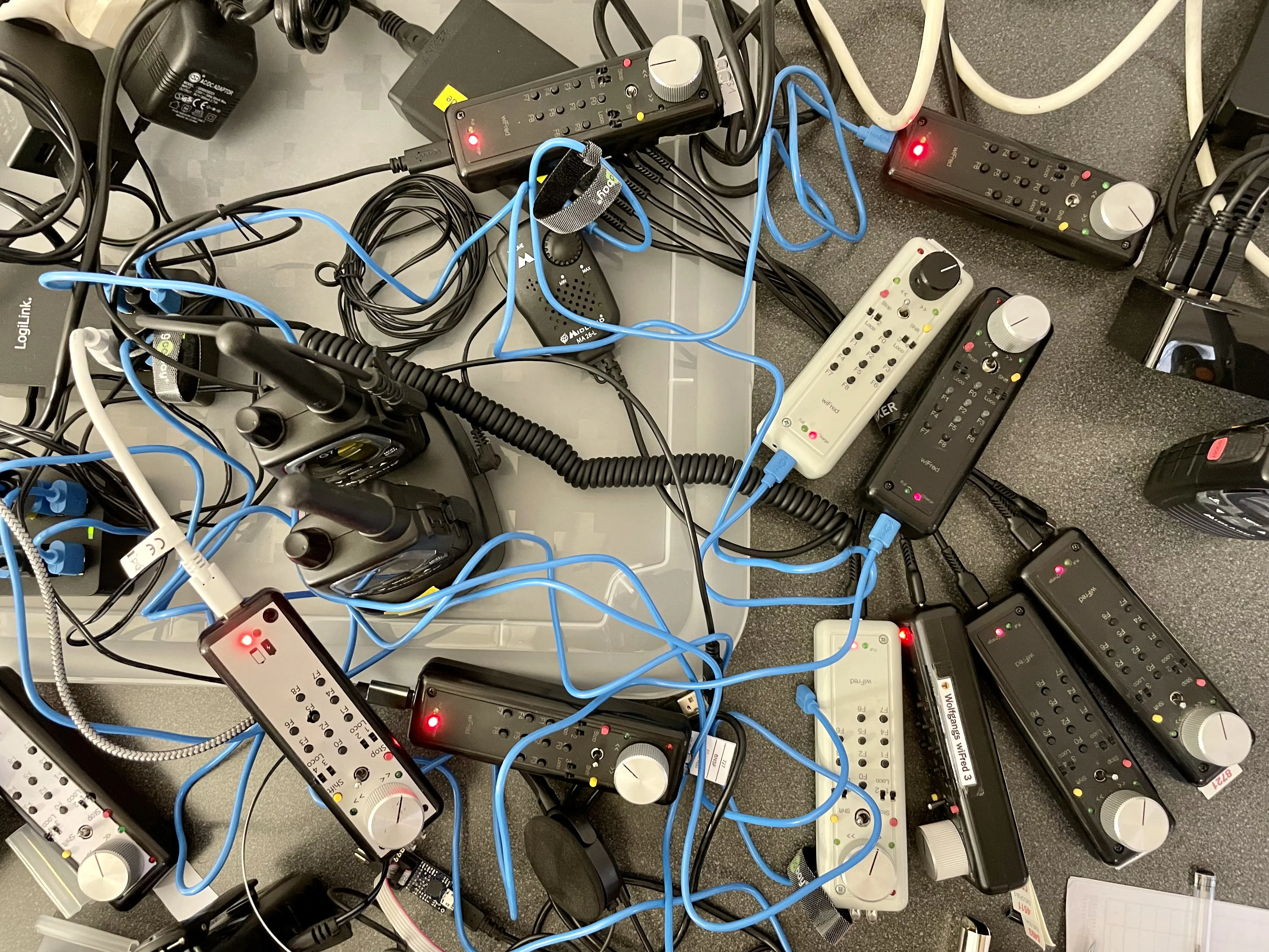 All trains were controlled wireless. We used our WiFreds connected to a laptop and a DCC-central. It worked without any problems. We only charged the controllers during session-turnover, but it was sufficient to keep them operational for the whole meeting.