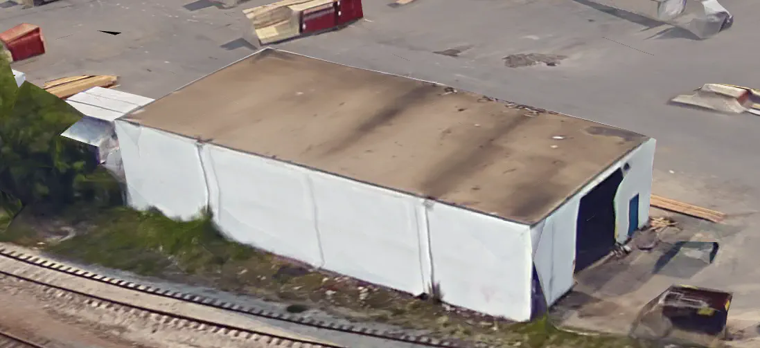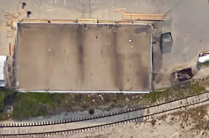 To build the ramp, I took measurements in Google Earth. The ramp seems to be built of concrete. The wall pointing away from the track is higher as a safety measure to prevent fork lifts to drive off the ramp. Some steel plates are lying on or near the ramp to cover the gap between the ramp the rail car.